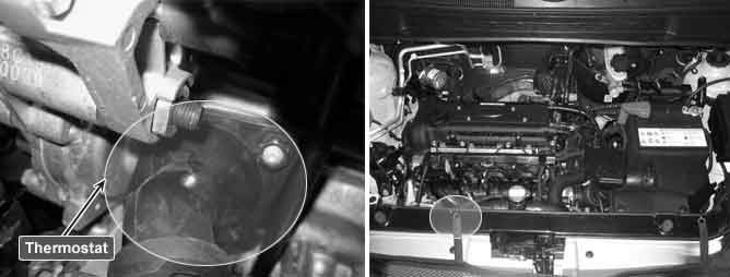 Thermostat , installed between engine and radiator, is automatically opened or closed in order to control the amount of flowing water so that ECM maintains engine coolant temperature at certain level. If, generally, engine coolant temperature reaches about 80°C (176 °F), wax in the thermostat is expended in order to open the valve. And, reversely, if coolant temperature is low, wax in the thermostat is contracted that makes valve is closed. The Thermostat maintains engine temperature to achieve the best engine performance plus prevent overheat and overcooling.
