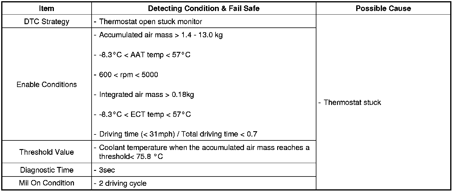 Checking time and coolant temperature under detecting condition, if the coolant temperature dose not reach the target temperature as the test timer reaches the threshold time, ECM sets P0128.