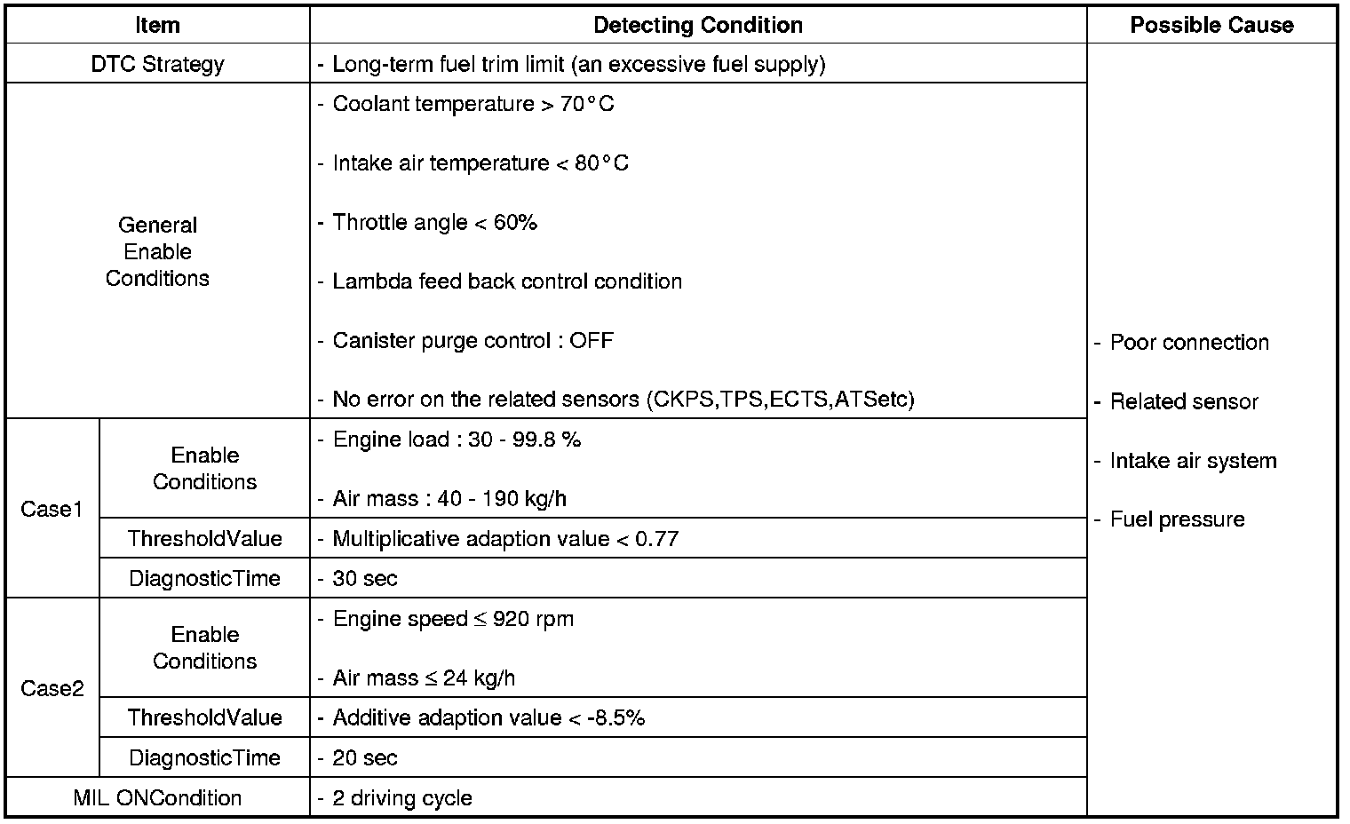 If the correction value of air-fuel ratio is lower than the threshold value, ECM sets DTC P0172.