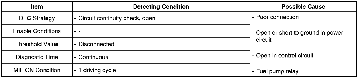 The ECM provides ground to one side of the coil in the fuel pump relay to control the fuel pump relay. The other side of the fuel pump relay coil is connected to fuel pump relay, which activates when the ignition switch is ON. The ECM monitors the control circuit between the fuel pump relay and the ECM. When the ignition switch is turned ON, the ECM energizes the fuel pump relay, which sends power to the fuel pump.
