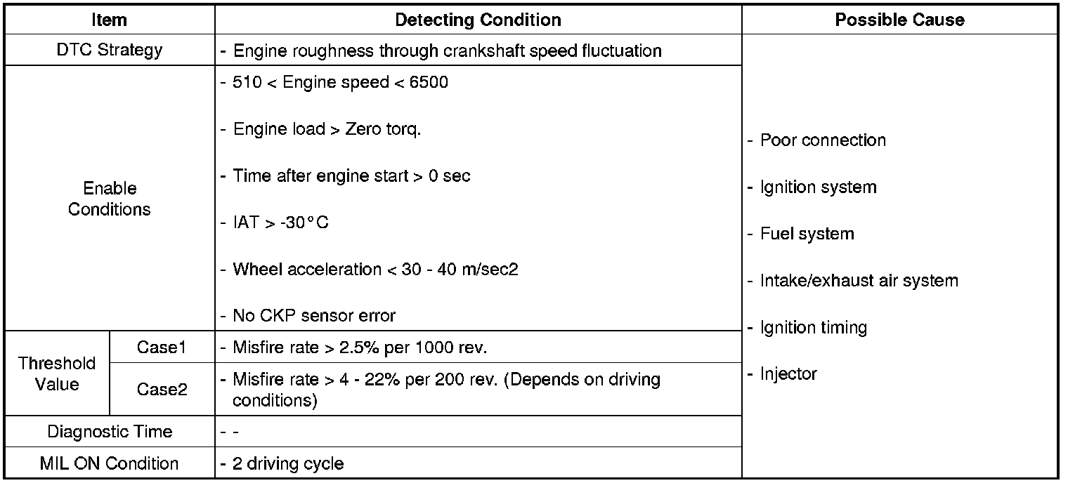 Misfires can be caused by lack of combustion in a cylinder due to absence of spark, poor fuel metering, poor compression, or many other causes. Even a small number of misfires may result in excessive exhaust emissions due to the unburned mixture. Increased misfire rates cause damage to the catalytic converter. The ECM monitors the crankshaft speed variation to determine if any misfiring generated. The ECM identifies the specific cylinder in which the misfire has occurred and counts individual misfire events by monitoring changes in the crankshaft rotation for each cylinder. A random misfire indicates one or more cylinders are misfiring.