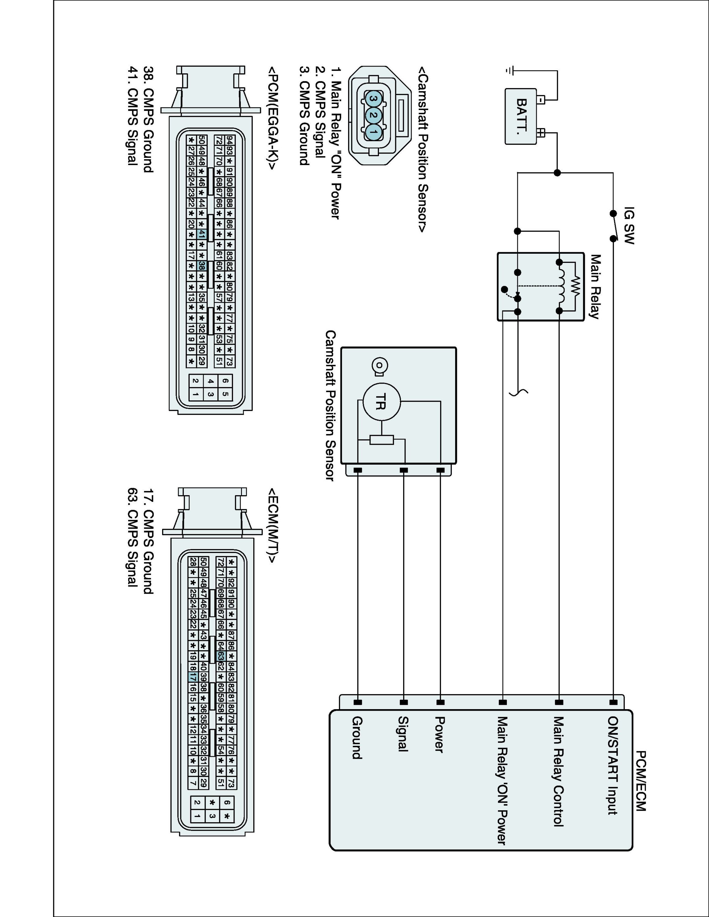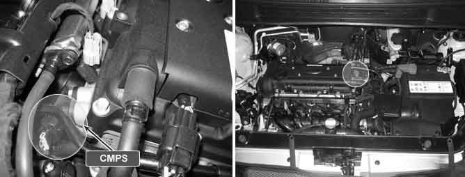 Camshaft Position Sensor (CMPS) is a hall sensor and detects the camshaft position by using a hall element. It is related with Crankshaft Position Sensor (CKPS) and detects the piston position of the each cylinder which the CKPS can't detect. The CMPS are installed on engine head cover and uses a target wheel installed on the camshaft. This sensor has a hall-effect IC which output voltage changes when magnetic field is made on the IC with current flow. When teeth on the target wheel trigger the sensor, output voltage is 12 V. If not, it is 0 V. These CMP signal is sent to the ECM and used for determining the ignition timing along with CKP signal. CMPS makes Sequential Injection possible.