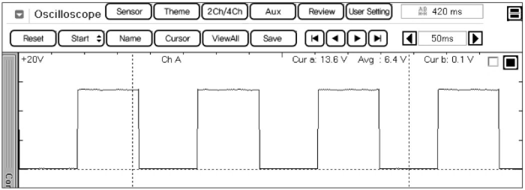 This example shows a typical Crankshaft Position Sensor (CkPS) and Camshaft Position Sensor (CMPS) waveform at idle. The ECM controls the injection and ignition timing by using these signals. Generally CkPS signal is used to detect the piston's position and CMPS signal is used to detect the Top Dead Center of each cylinder.