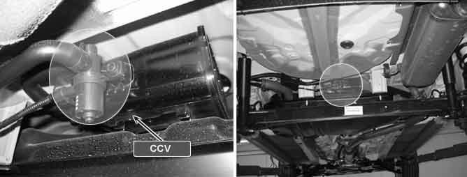 The evaporative emissions system prevents hydrocarbon (HC) vapors from the fuel tank from escaping into the atmosphere where they could form photochemical smog. Gasoline vapors are collected in the charcoal canister. The Canister Closing Valve (CCV) closes off the air inlet into the canister for leak detection of the evaporative emission system. The CCV also prevents fuel vapors from escaping from the canister. When the engine purges the HC vapors from the canister, the clean air comes into the canister through the canister air-filter and the CCV.