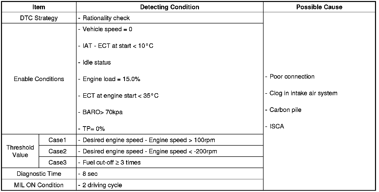If actual engine speed is over the 100 rpm lower than desired engine speed, or over the 200 rpm higher than desired engine speed, ECM set P0505 code.
