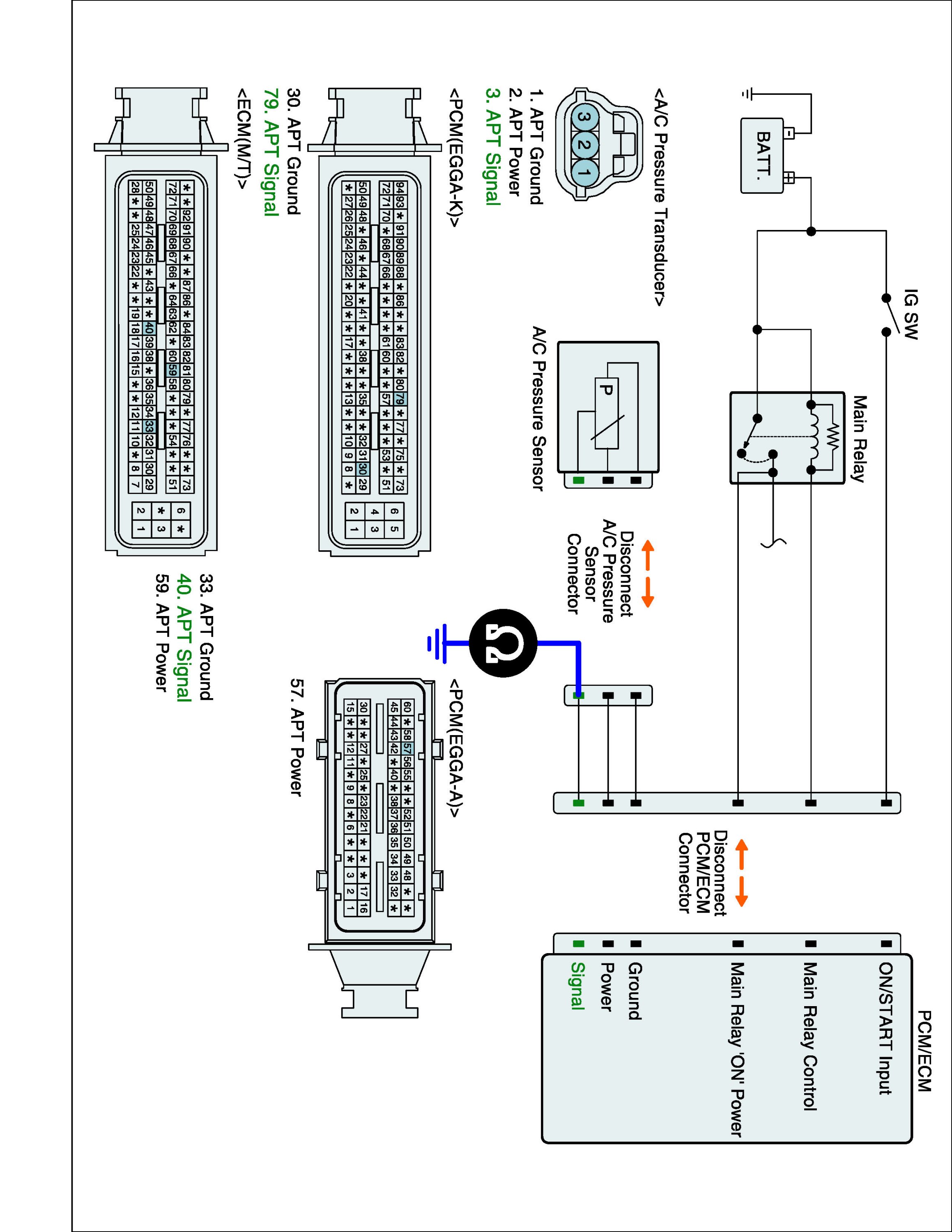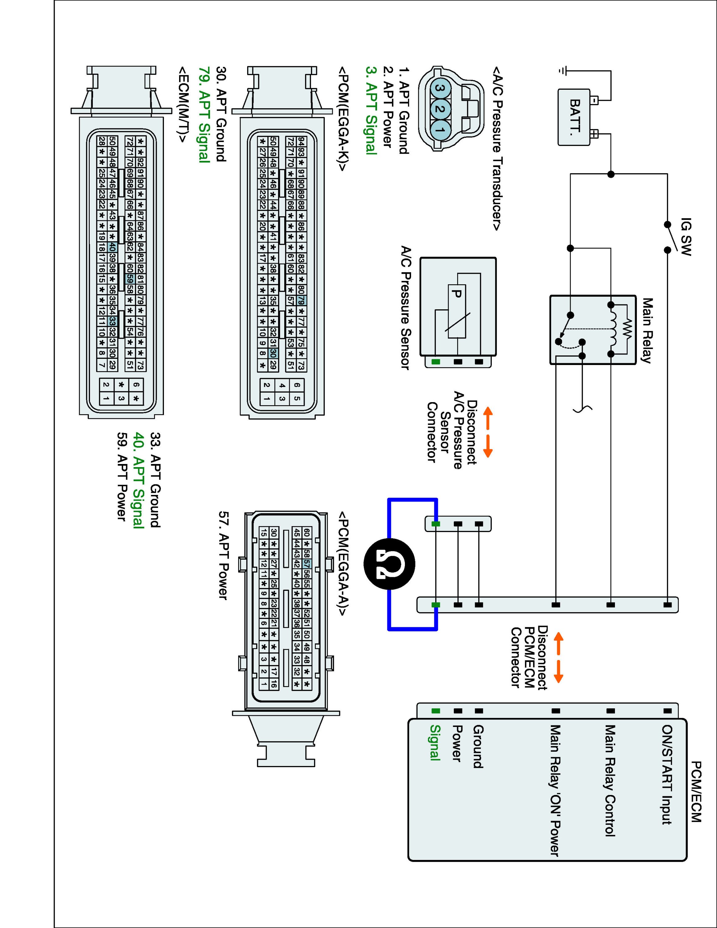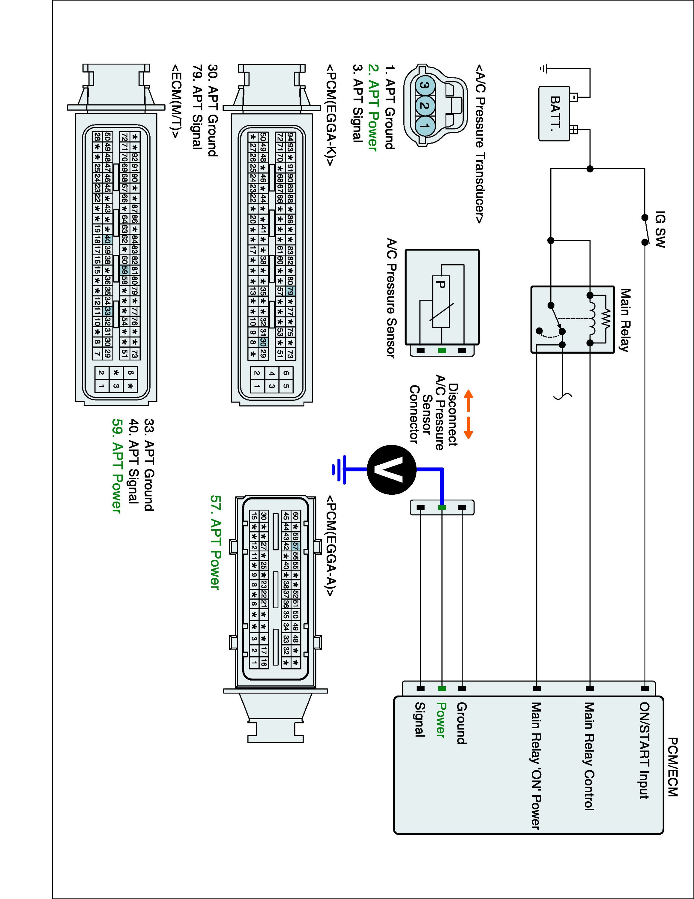 1. IG "OFF" and disconnect A/C pressure sensor and ECM connector.