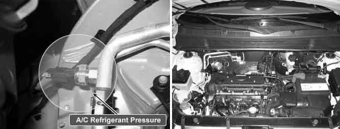 The ECM (Engine Control Module) receives pressure signal in the A/C refrigerant high pressure side from the A/C refrigerant pressure sensor. This input indicates how much load the A/C compressor is putting on the engine and is one of the factors used by the ECM in order to determine the idle air control position for the idle speed. The circuits consist of a 5 V reference and a ground, both provided by the ECM, and a signal from the sensor. The signal is a voltage which is proportional to the A/C pressure from 0 to 5 V. Low pressure produces a low voltage signal and high pressure a high-voltage signal.