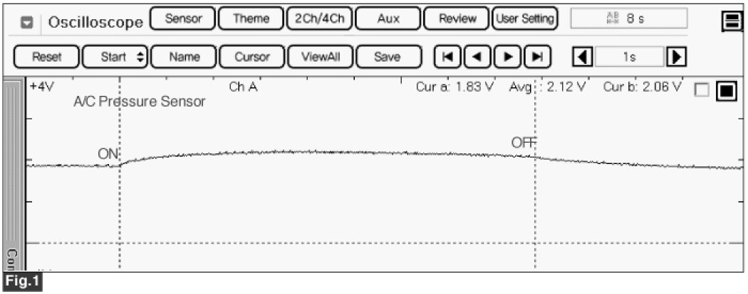Fig 1) Normal waveforms of A/C pressure sensor during the time from turning on A/C switch to turning off A/C switch