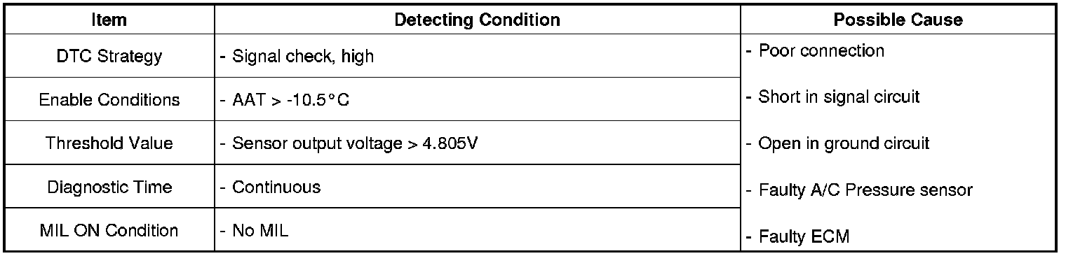 Checking output signals from A/C pressure sensor under detecting condition, if an signal above 4.805 V lasts for more than 10 sec., ECM sets P0533.