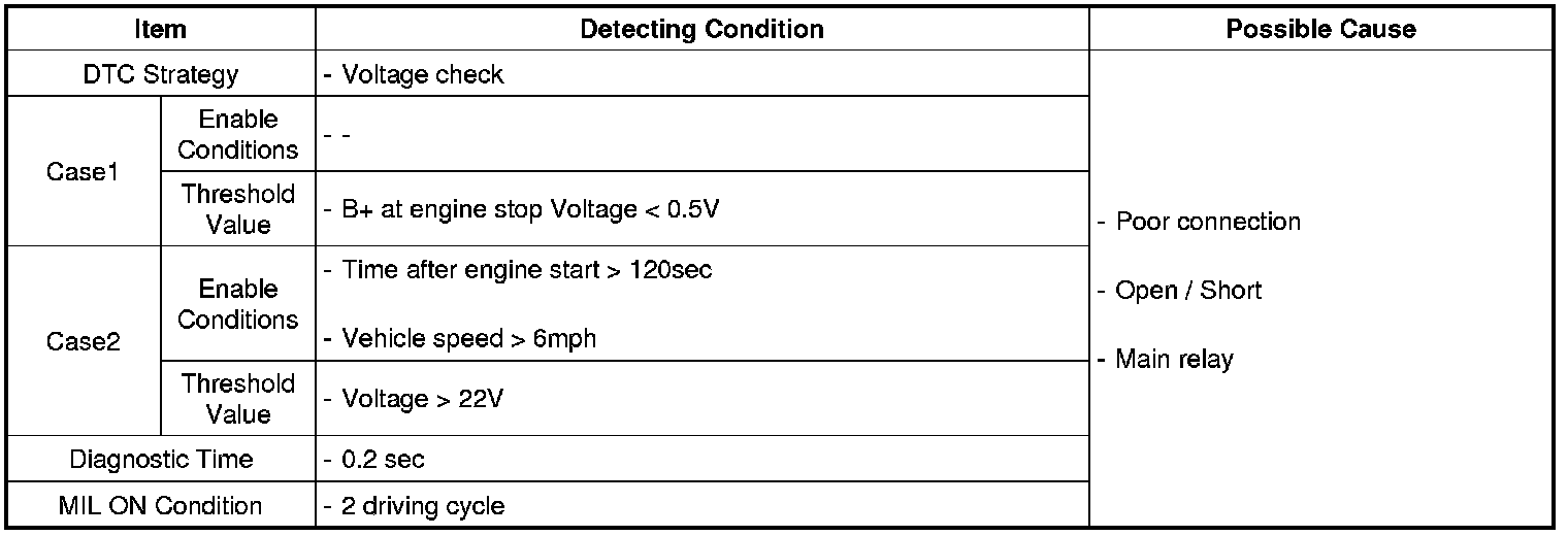 The purpose of the System Voltage is to detect an excessively low or high system voltage that may be caused by a malfunctioning charging system. System Voltage is the ignition voltage potential at the Powertrain Control Module (ECM)ECM measures and compares voltage from ignition key and each relay. With this mechanism, ECM knows if the main relay switch turns on after IG on or if turns OFF after IG off.