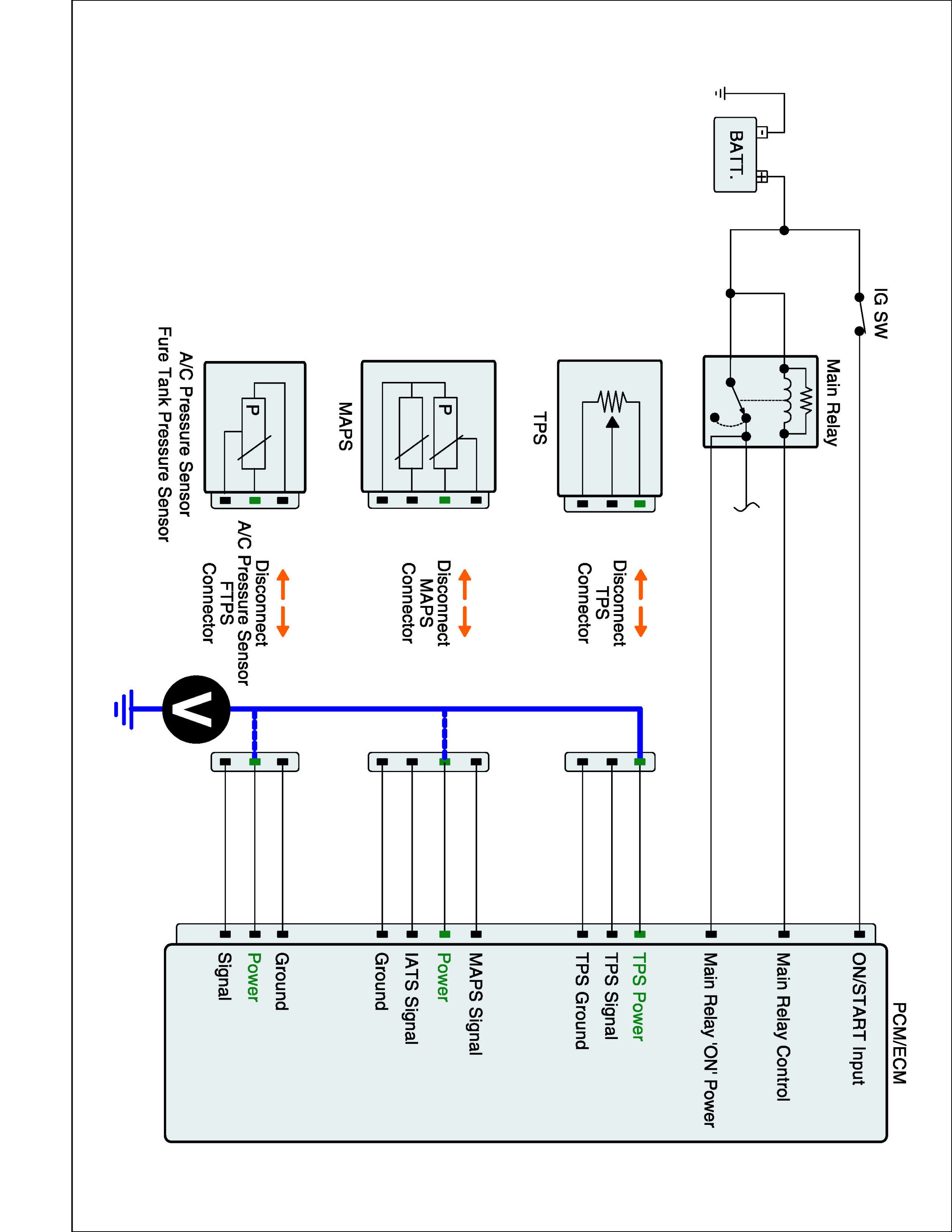 1. IG "OFF" and disconnect TPS, MAPS, A/C Refrigerant Pressure Sensor, Fuel Tank Pressure Sensor connector.