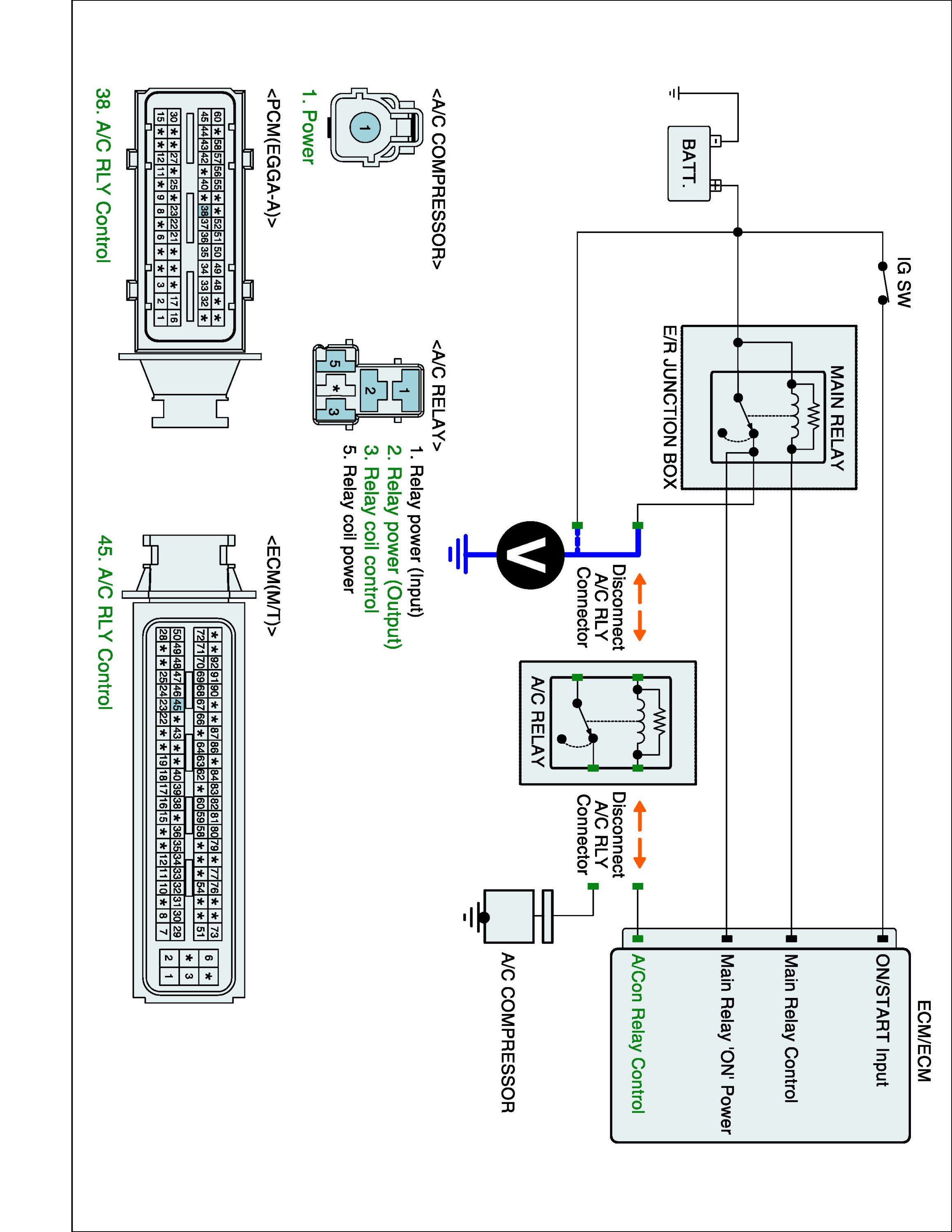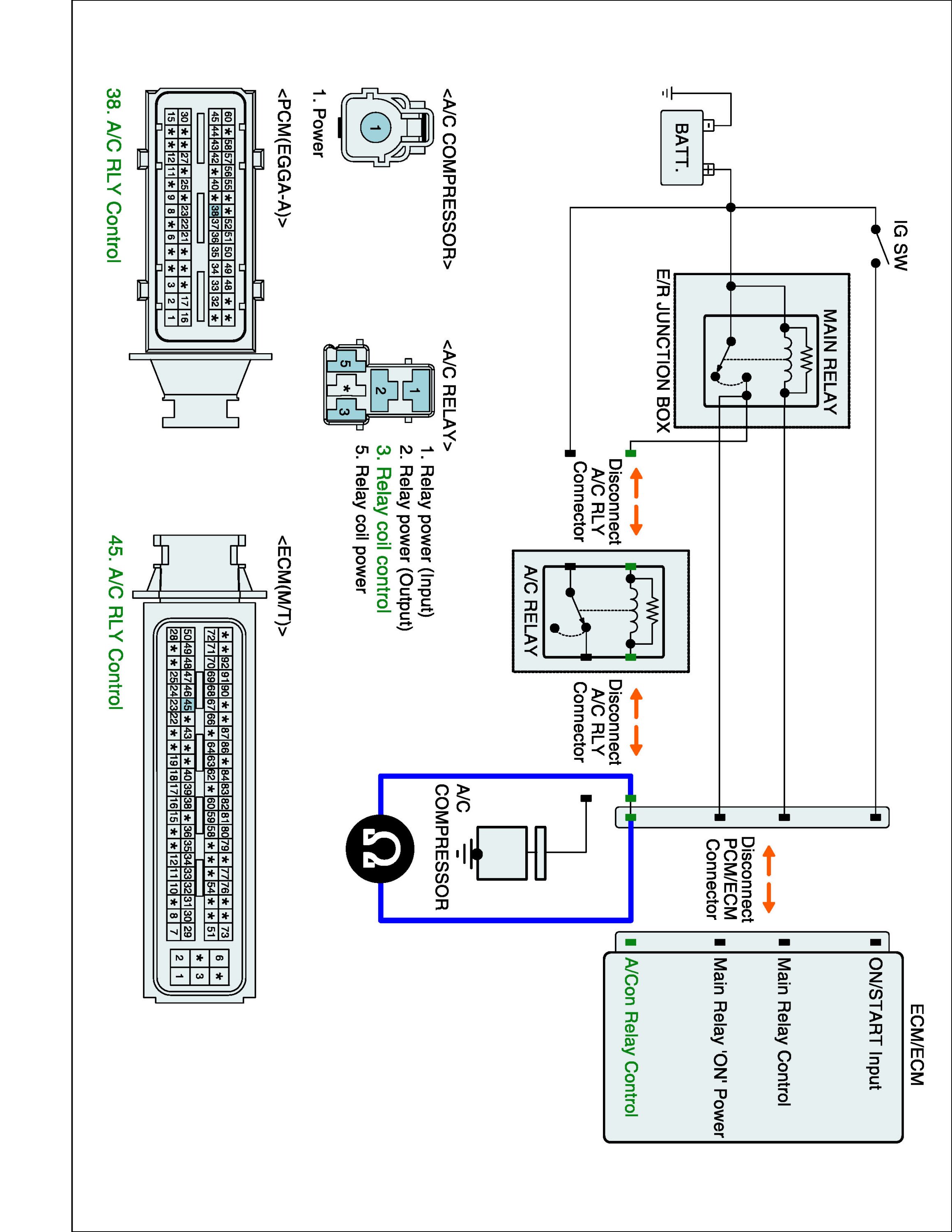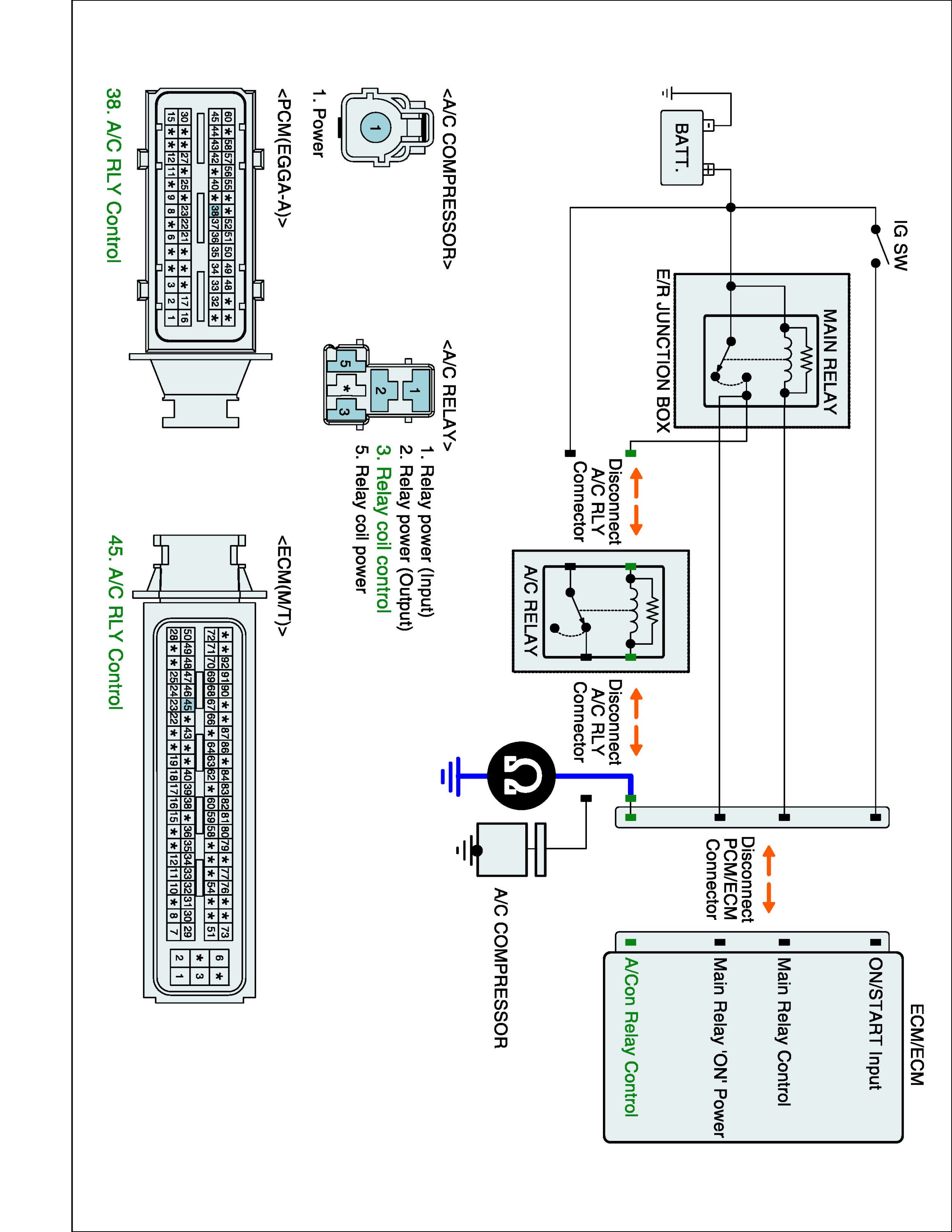 1. IG "OFF" and disconnect A/C relay and ECM connector.