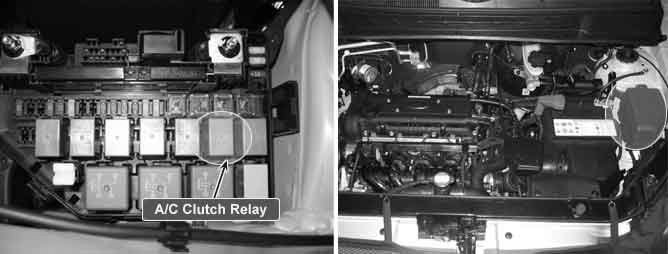 The A/C clutch relay is activated if the A/C switch is operated while the blower is running and system operation is enabled by the ECM. When A/C is requested, the Engine Control Module (ECM) provides a ground path to the A/C clutch relay control circuit. When the relay circuit is grounded, the A/C clutch relay is energized. The ECM delays grounding the relay circuit for a short time, so the ECM can adjust the engine idle speed for the additional load. The ECM will temporarily de-energized the A/C clutch relay for one or more of the following conditions: