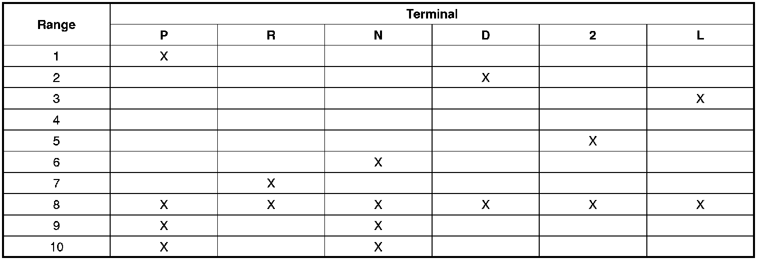 [ RANGE SWITCH continuity check table (Case of SPORTS MODE vehicle has no 3,2,L range) ]