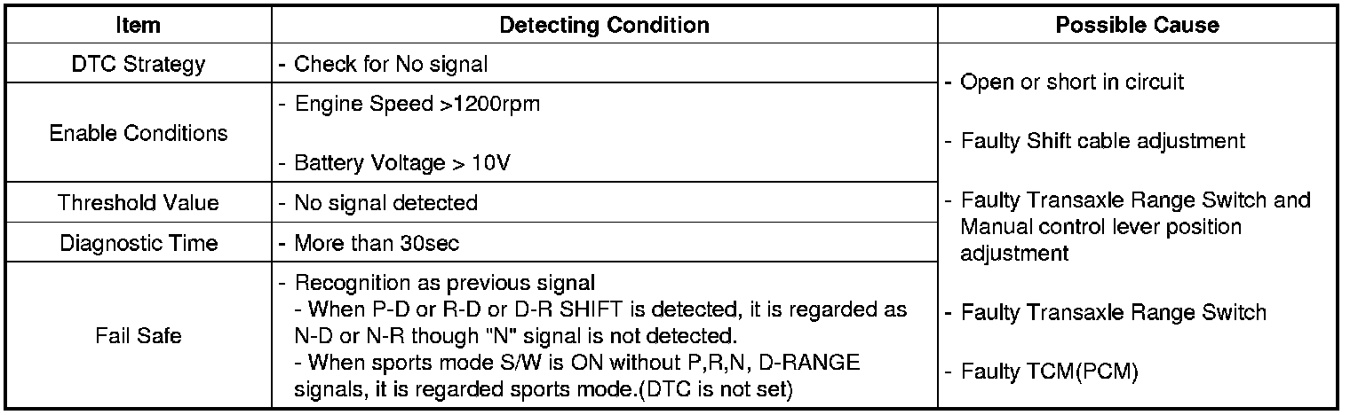 The TCM (PCM) sets this code when the Transaxle Range Switch has no output signal for more than 30 seconds.