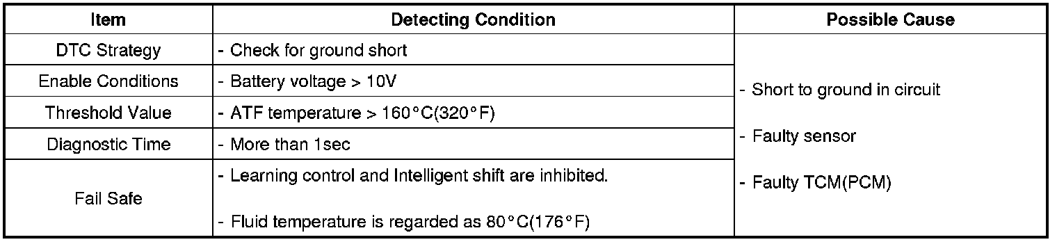 This DTC code is set when the ATF temperature output voltage is lower than a value generated by thermistor resistance, in a normal operating range, for approximately 1 second or longer. The TCM (PCM) regards the ATF temperature as fixed at a value of 80 °C (176°F).