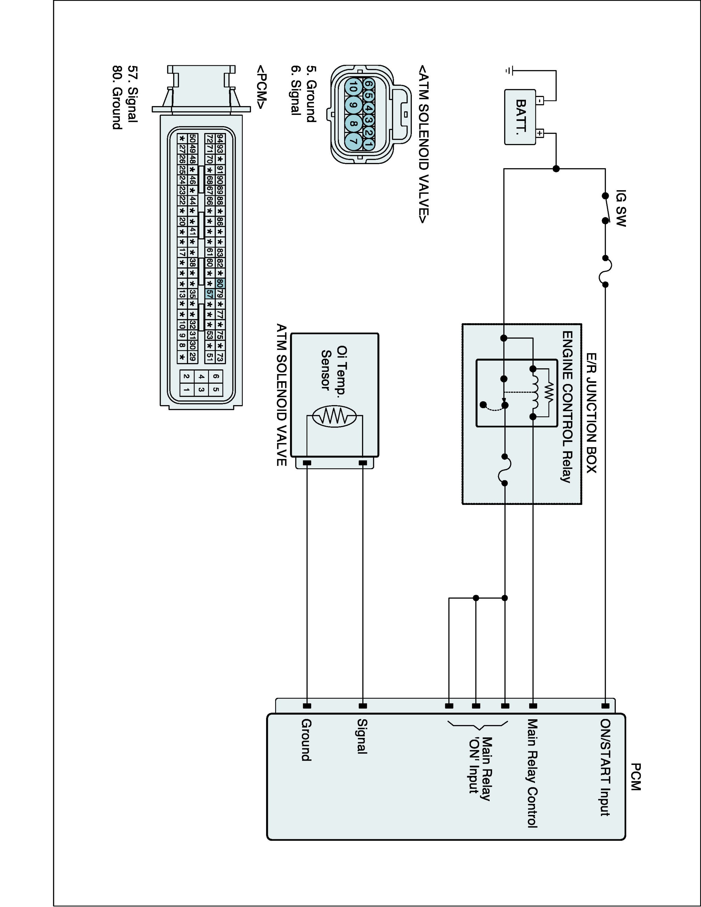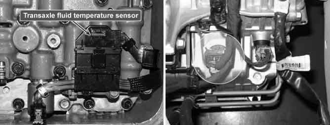 The automatic Transaxle fluid (ATF) temperature sensor is installed in the Valve Body. This sensor uses a thermistor whose resistance changes according to the temperature changes. The TCM (PCM) supplies a 5 V reference voltage to the sensor, and the output voltage of the sensor changes when the ATF temperature varies. The automatic Transaxle fluid (ATF) temperature provides very important data for the TCM (PCM)'s control of the Torque Converter Clutch, and is also used for many other purposes.