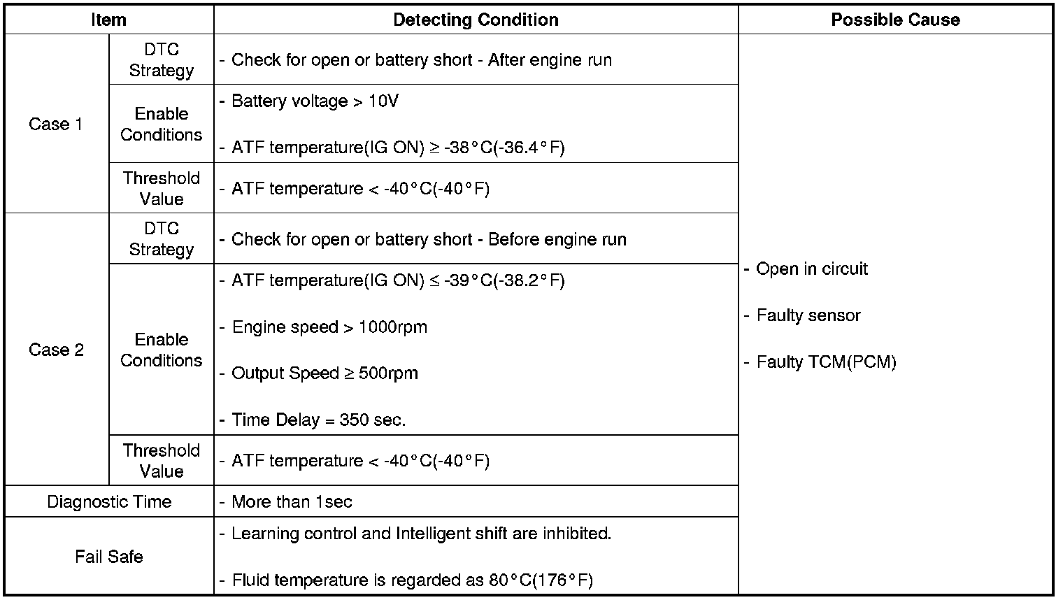 This DTC code is set when the ATF temperature output voltage is higher than a value generated by thermistor resistance, in a normal operating range, for an extended period of time. The TCM (PCM) regards the ATF temperature as fixed at a value of 80 °C (176°F).