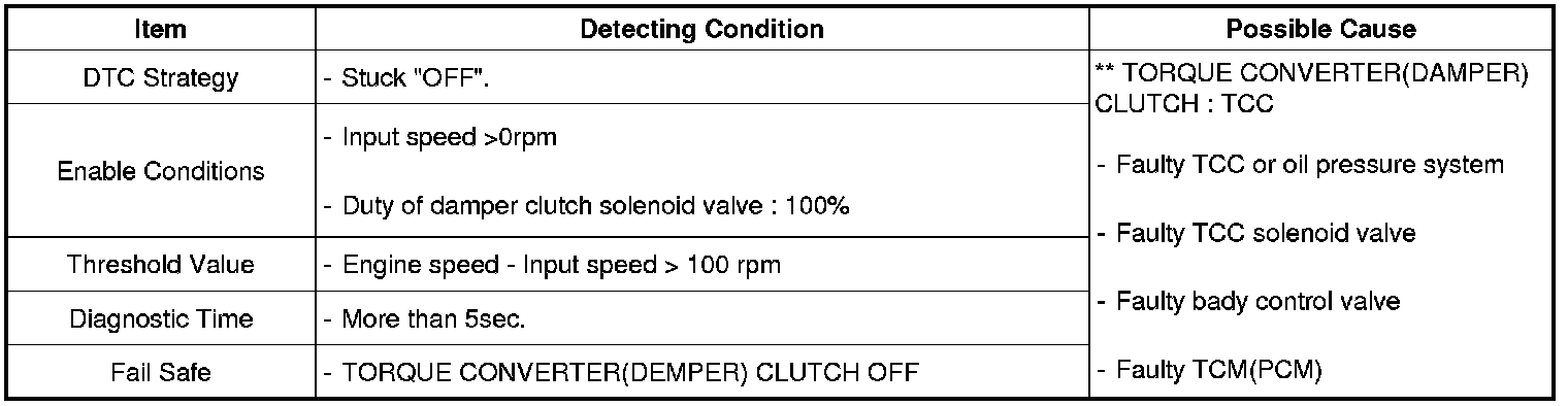 The TCM (PCM) increases the duty ratio to engage the Damper Clutch by monitoring slip rpms (difference value between engine speed and turbine speed). To decrease the slip of the Damper Clutch, the TCM (PCM) increases the duty ratio by applying more hydraulic pressure. When slip rpm does not drop under some value with 100% duty ratio, the TCM (PCM) determines that the Torque Converter Clutch is stuck OFF and sets this code.