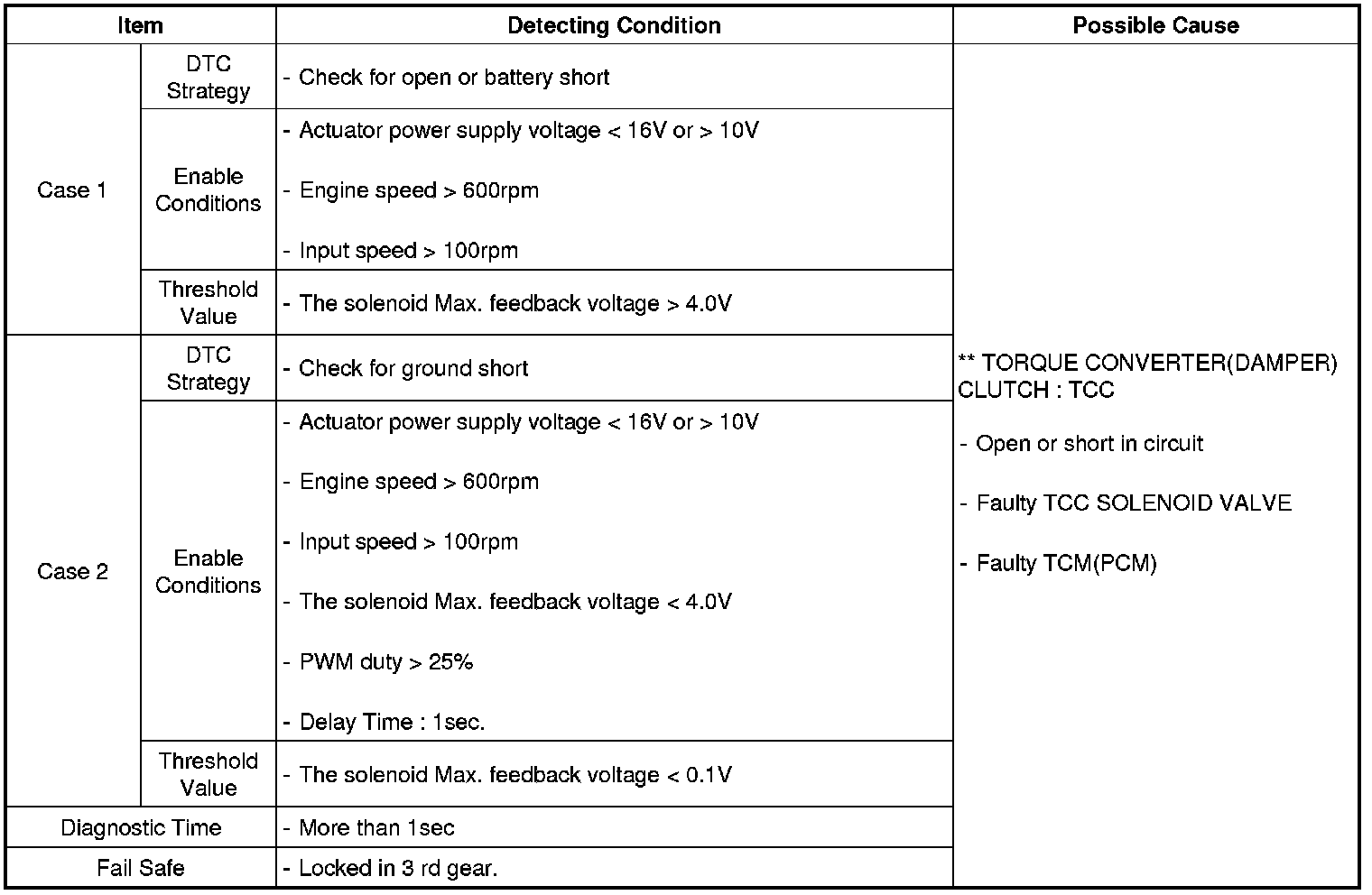 The TCM (PCM) checks the Damper Clutch Control Signal by monitoring the feedback signal from the solenoid valve drive circuit. If an unexpected signal is monitored (for example, high voltage is detected when low voltage is expected, or low voltage is detected when high voltage is expected) the TCM (PCM) judges that TCCSV circuit is malfunctioning and sets this code.