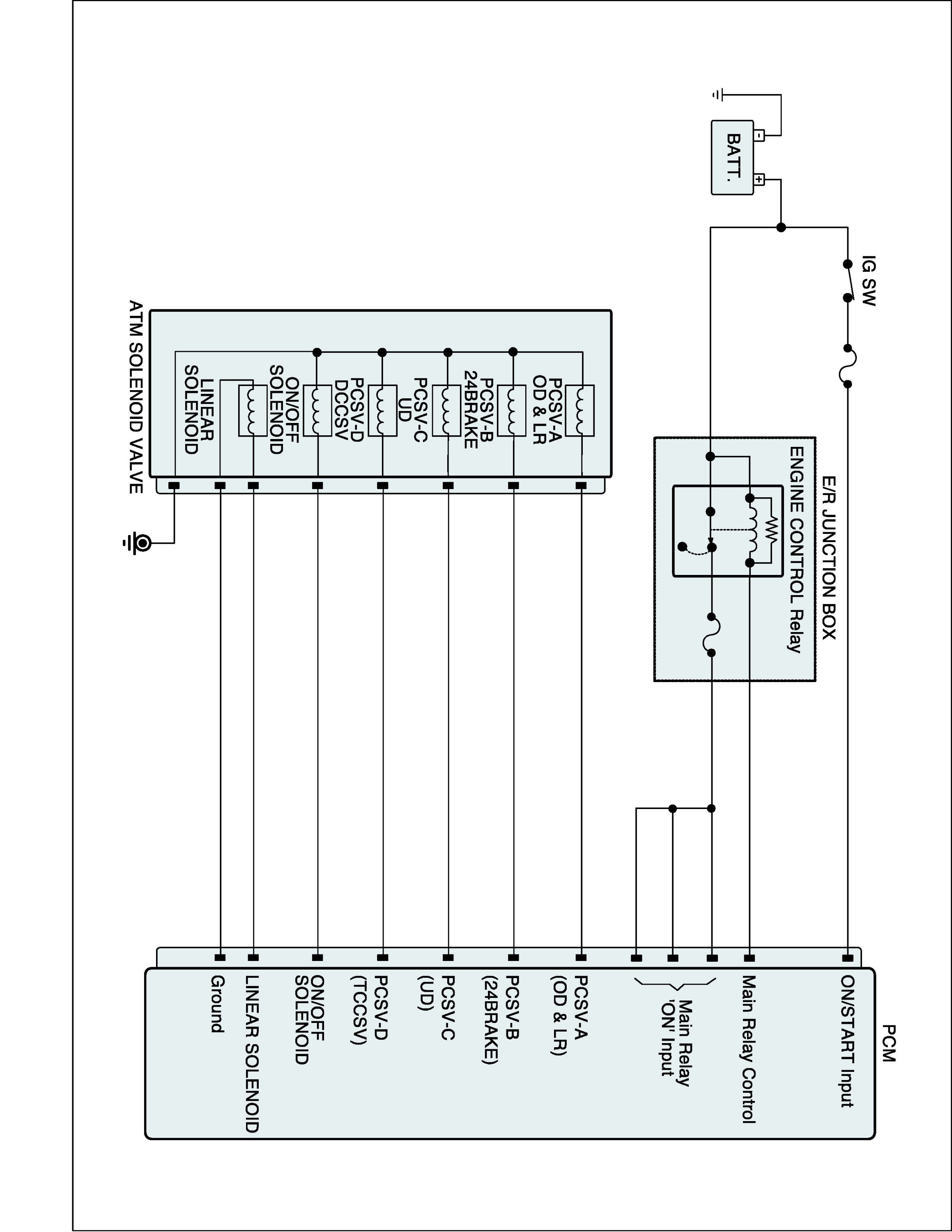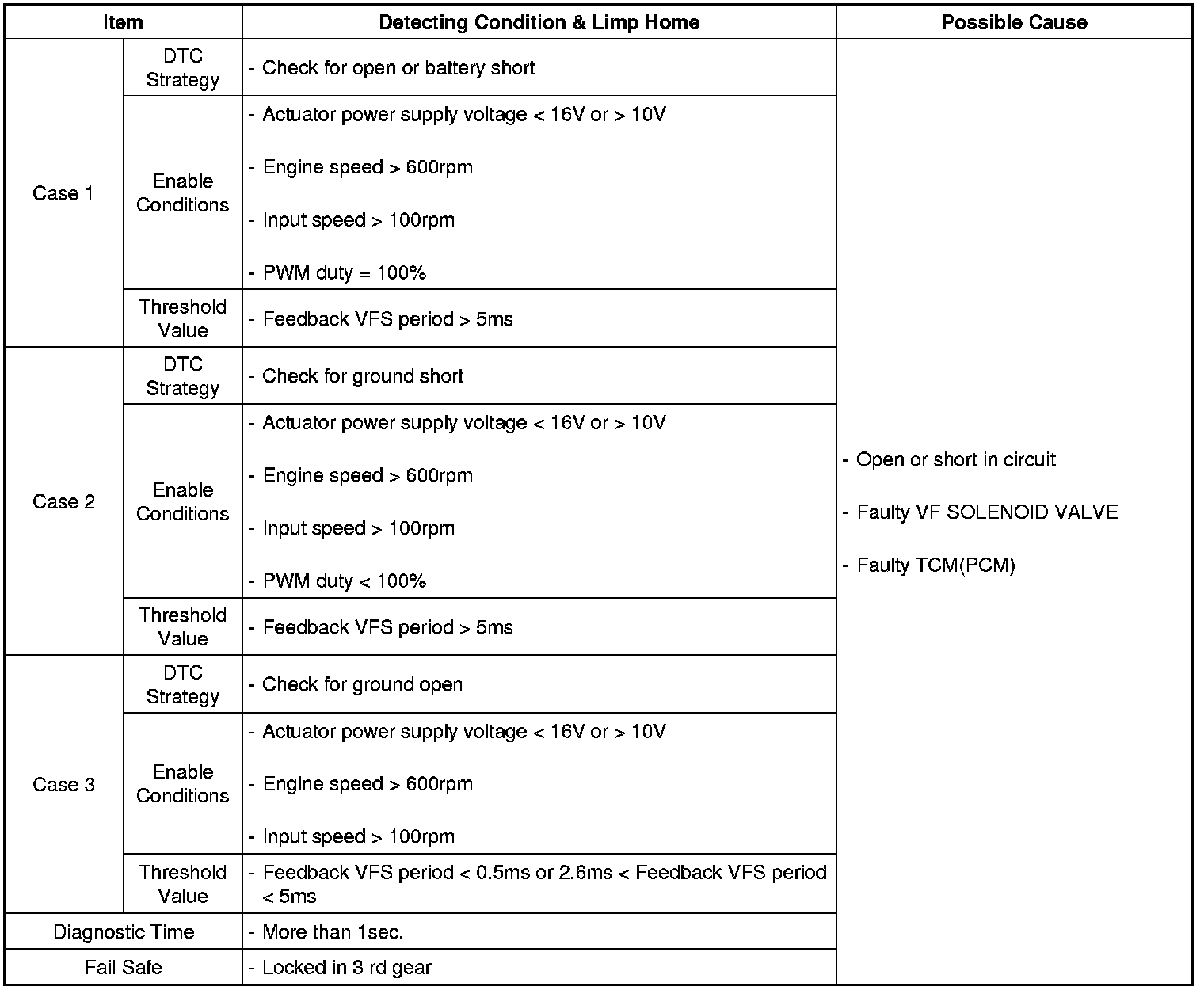 The TCM (PCM) checks the VFS Control Signal by monitoring the feedback signal from the solenoid valve drive circuit. If an unexpected signal is monitored (for example, high voltage is detected when low voltage is expected, or low voltage is detected when high voltage is expected), the TCM (PCM) judges that the Low and Reverse control solenoid circuit is malfunctioning and sets this code.
