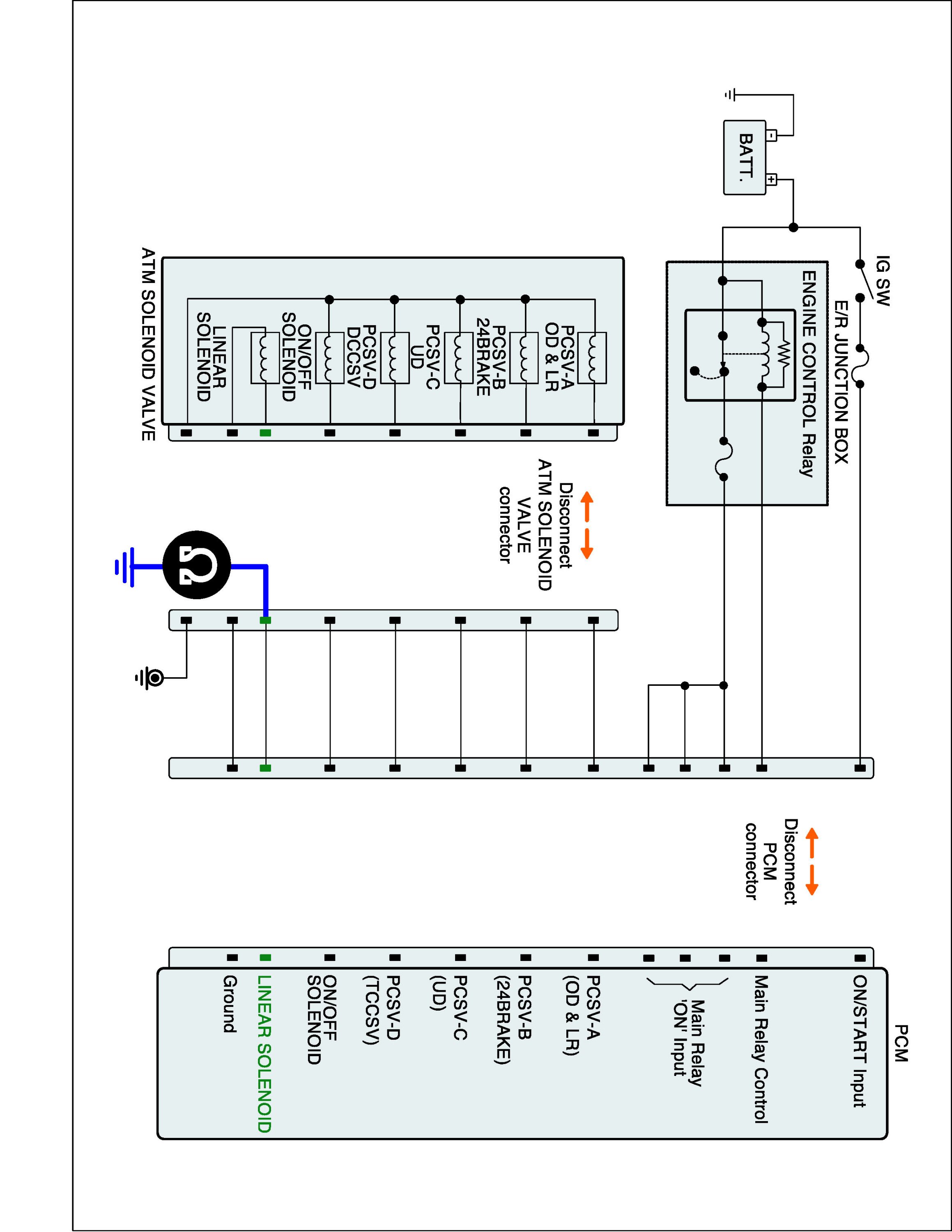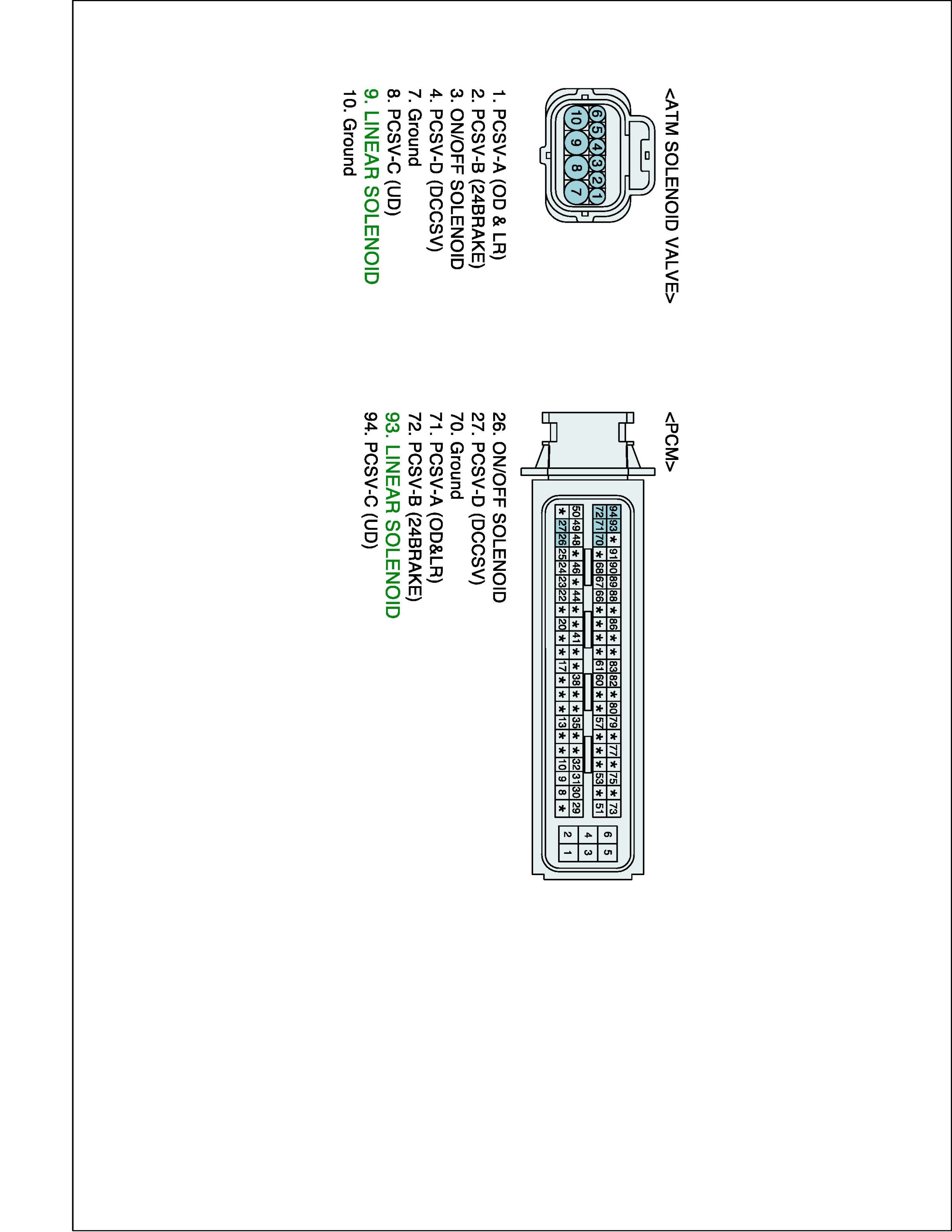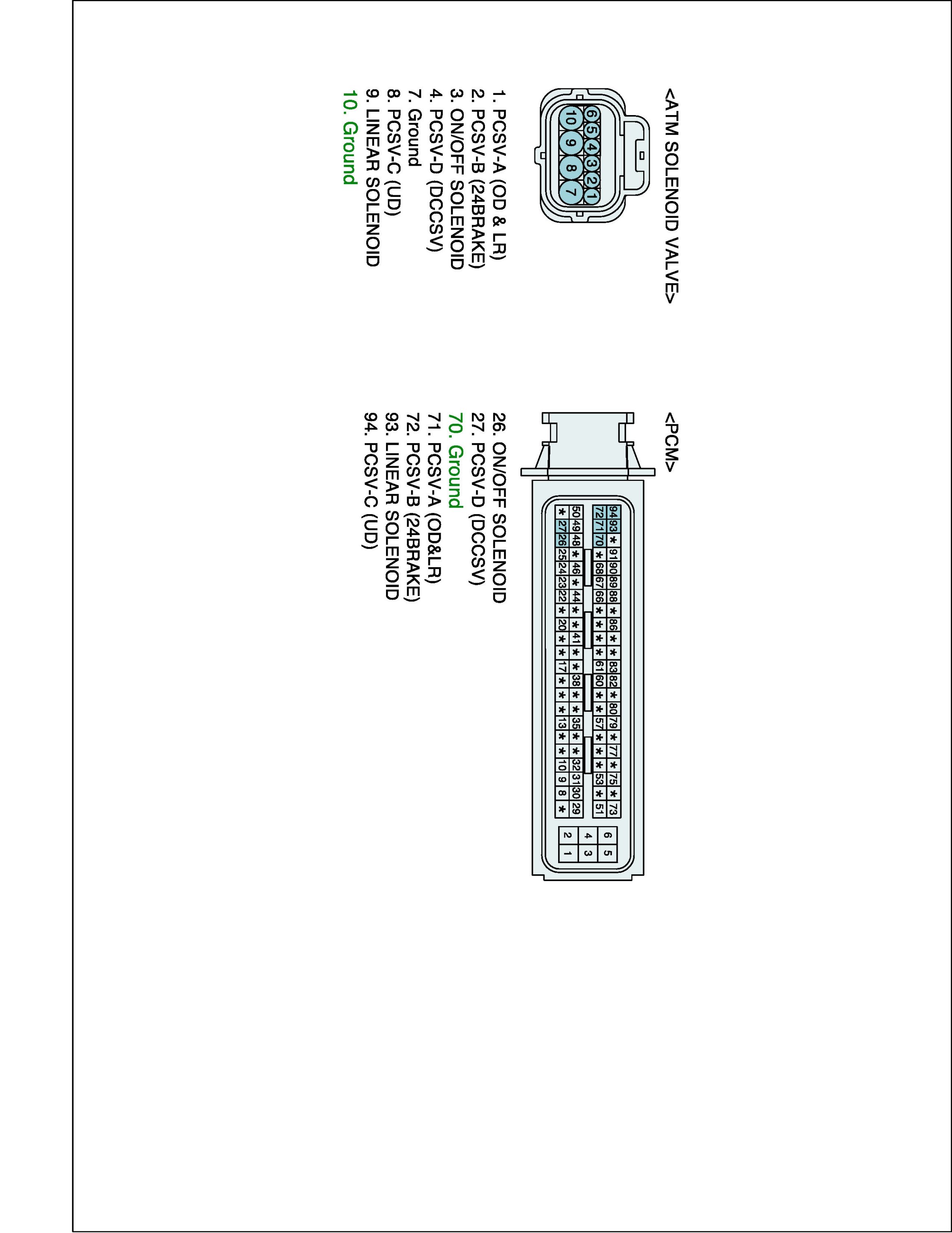 2. Disconnect "A/T SOLENOID VALVE" connector and "TCM (PCM)" connector.