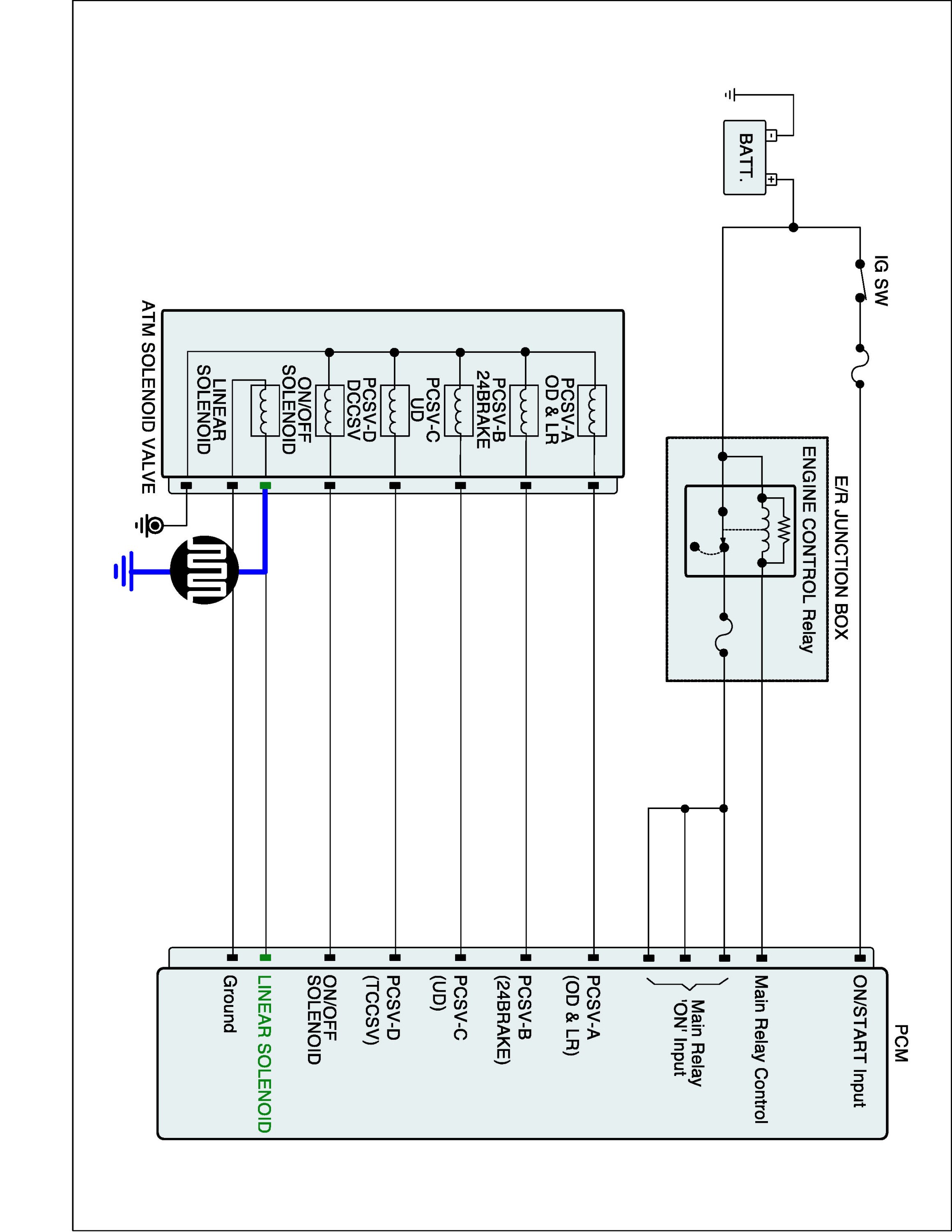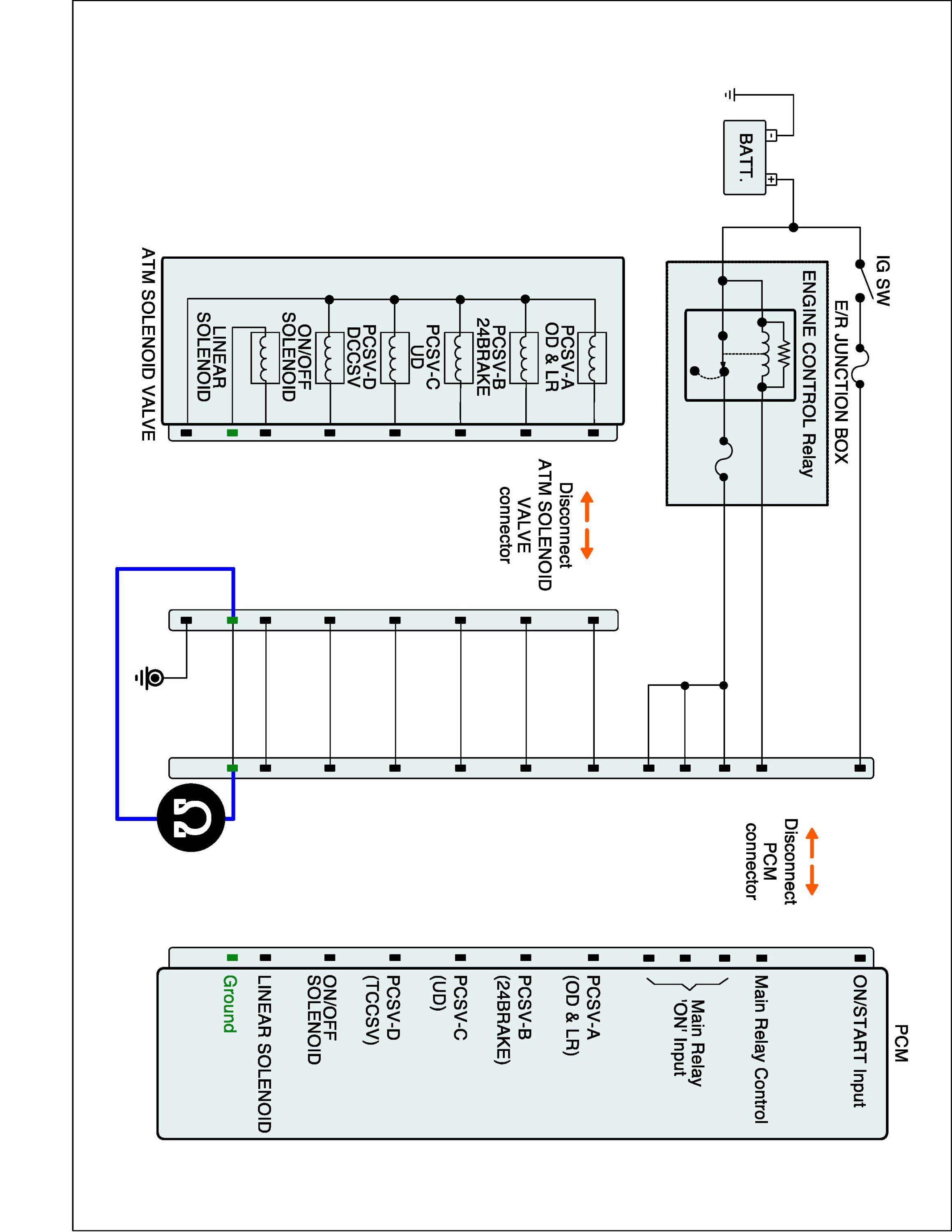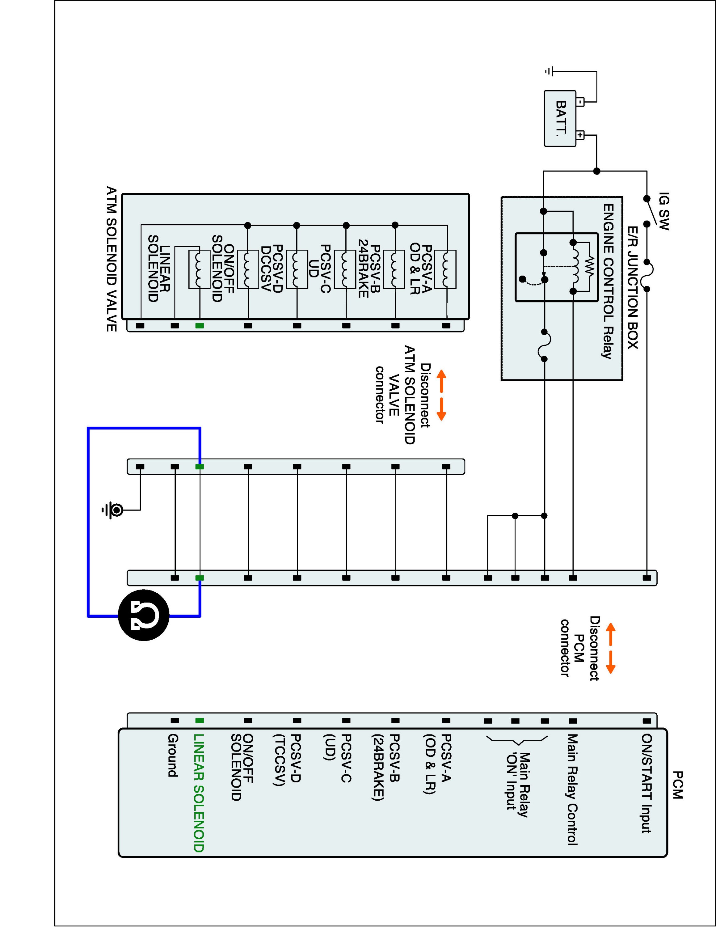 2. Disconnect "A/T SOLENOID VALVE" connector and "TCM (PCM)" connector.