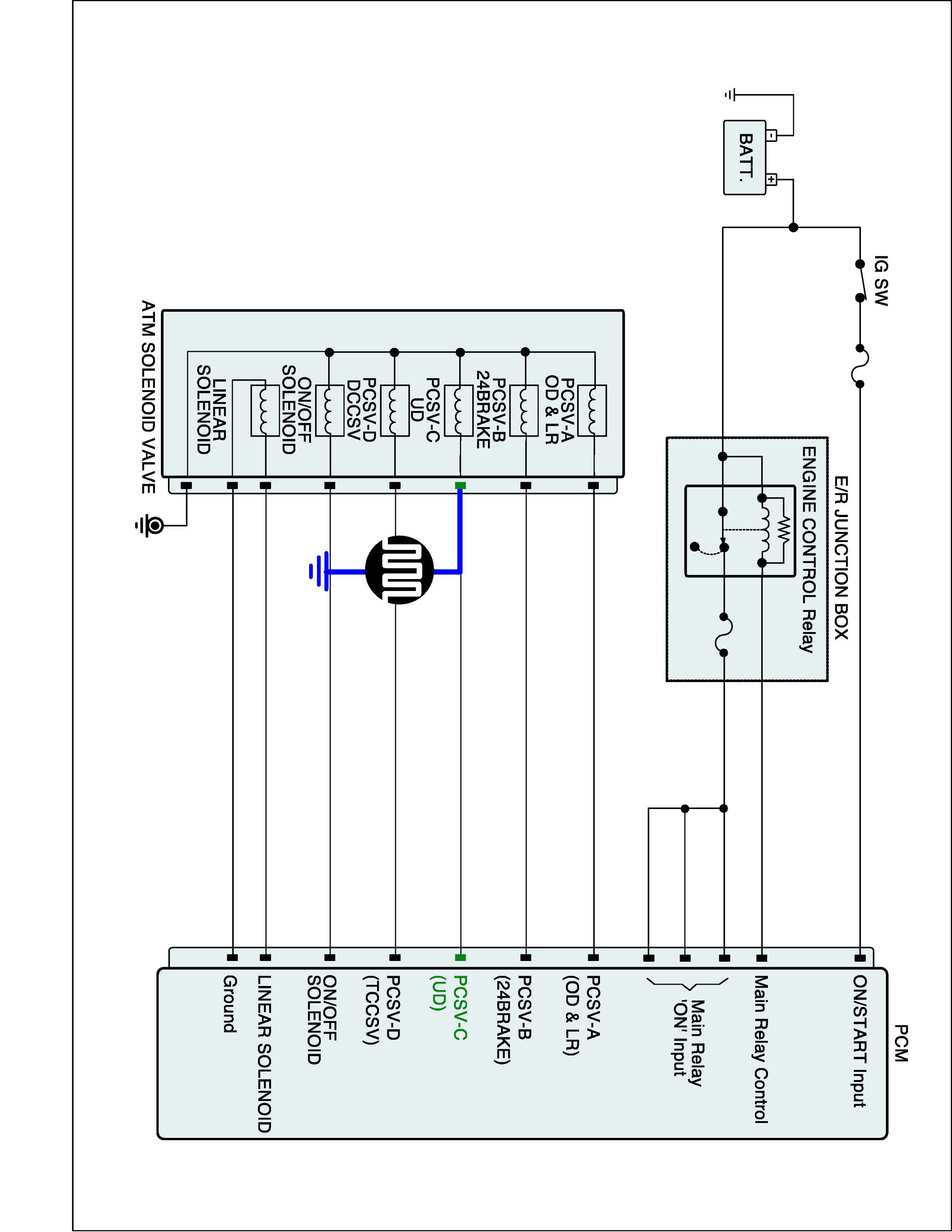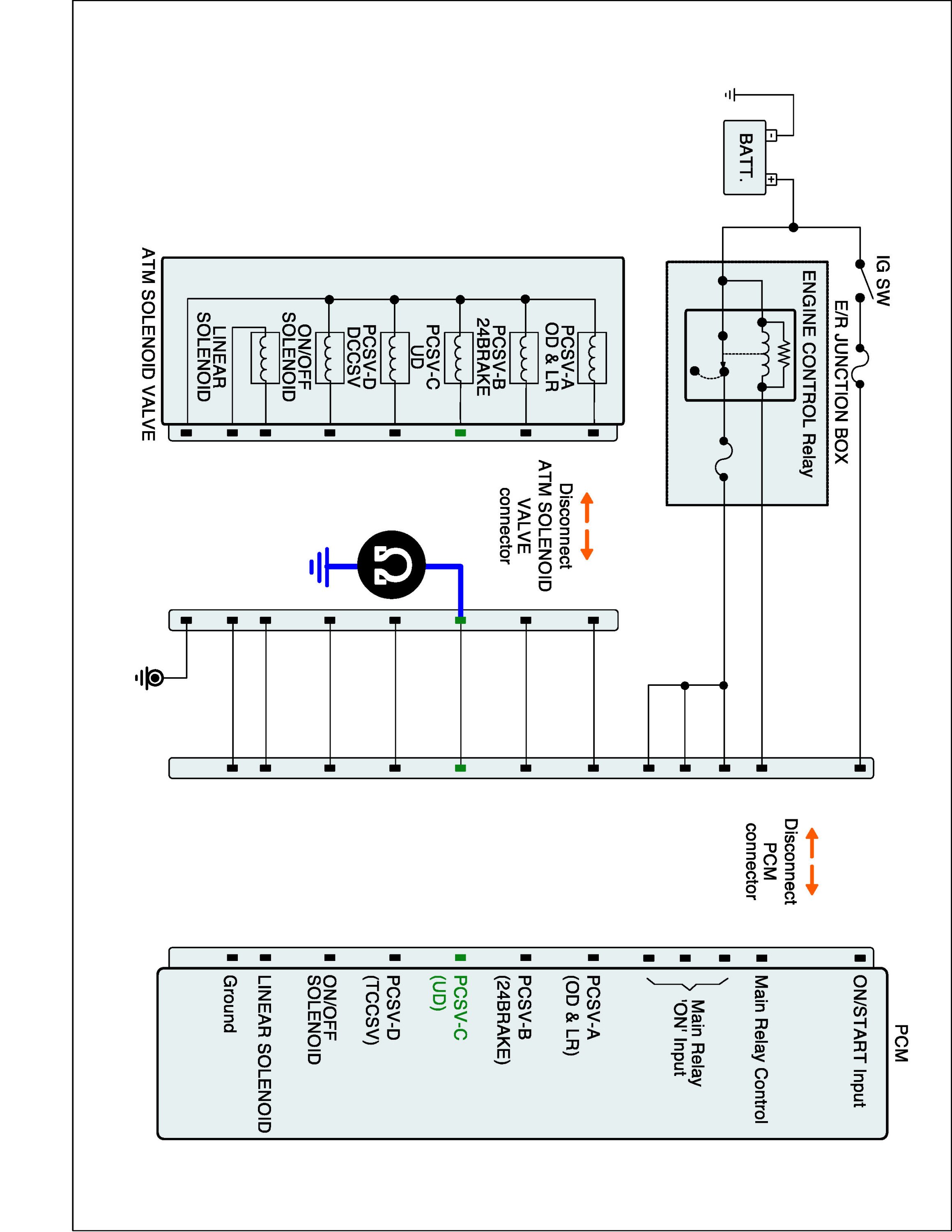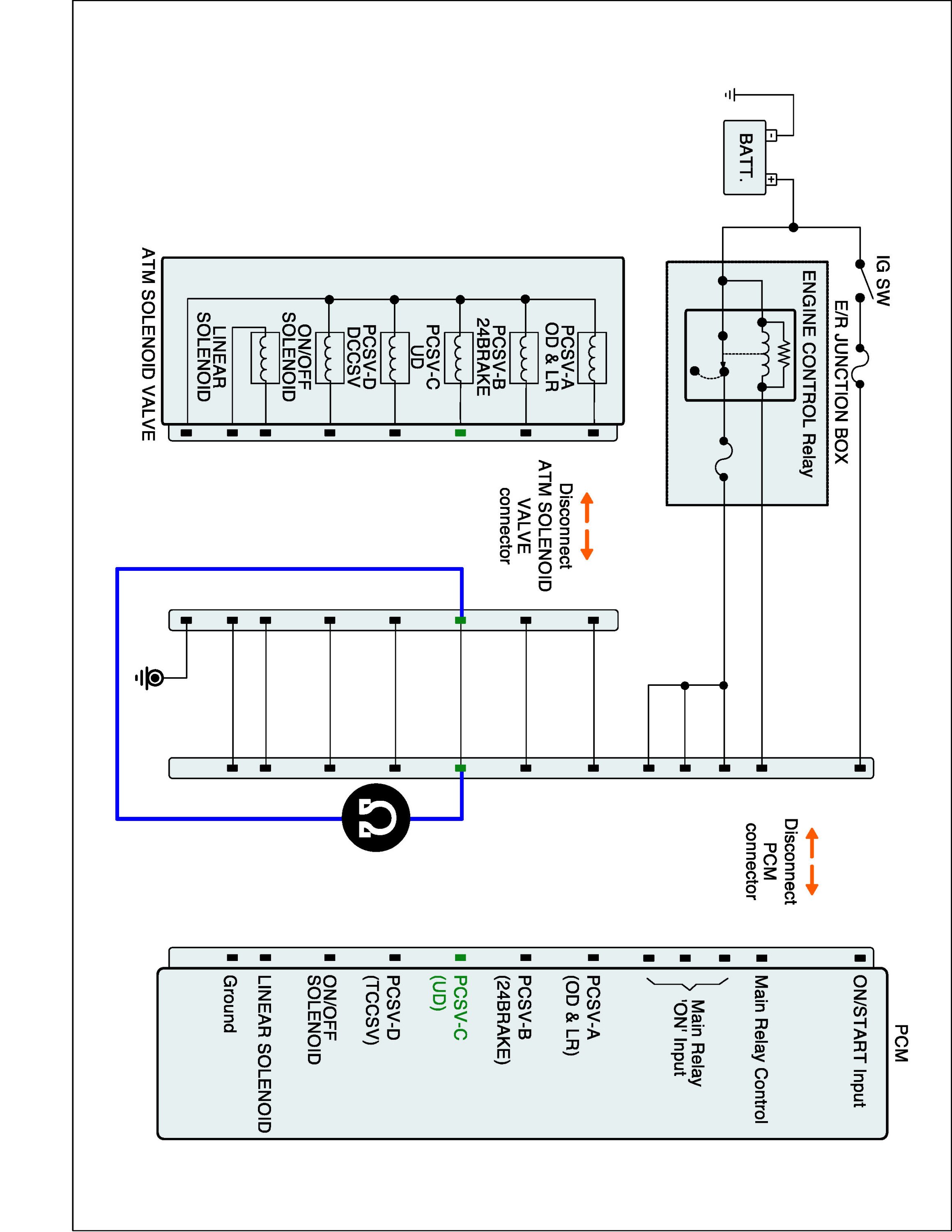 (3) Measure resistance between "PCSV-C (UD)" terminal of the ATM SOLENOID VALVE harness connector and "PCSV-C (UD)" terminal of the TCM (PCM) harness connector.
