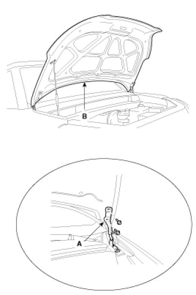 1. After loosening the hood hinge (A) mounting bolts, remove the hood (B).
