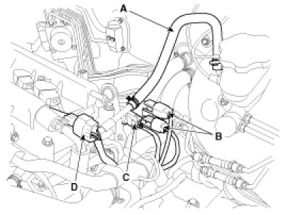 1. Disconnect the battery terminal (A) and ECM connector (B).