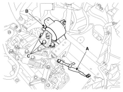 (12) Disconnect the compressor connector (A), the alternator connector (B) and the 'B' terminal cable (C).