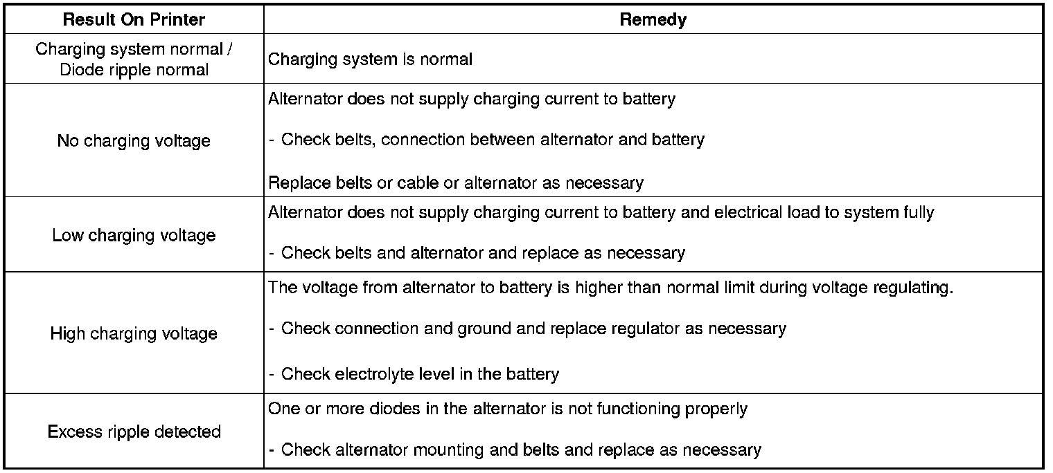 6. Take a relevant action according to the test results by referring to the table below after shutting off the engine and disconnect the tester clamps from the battery.