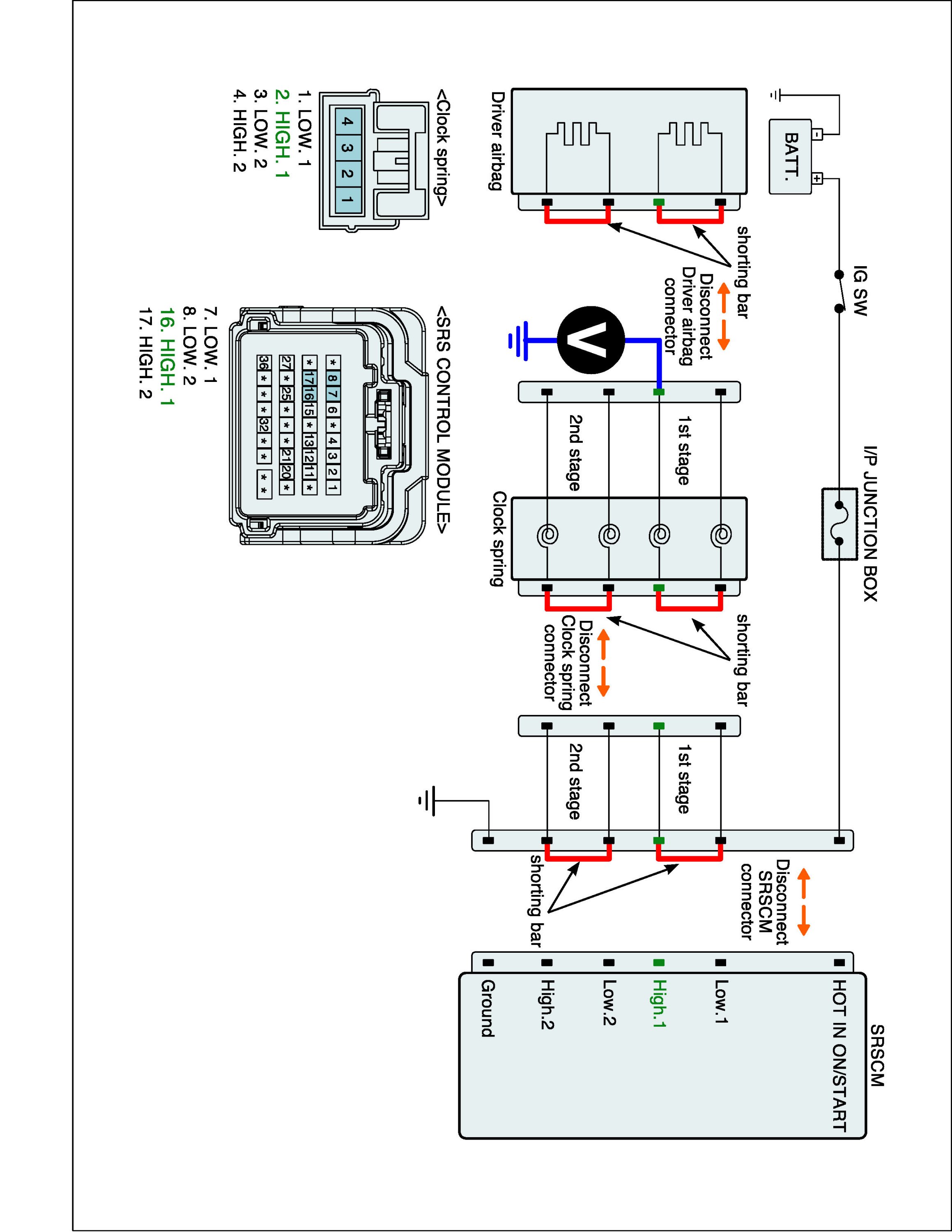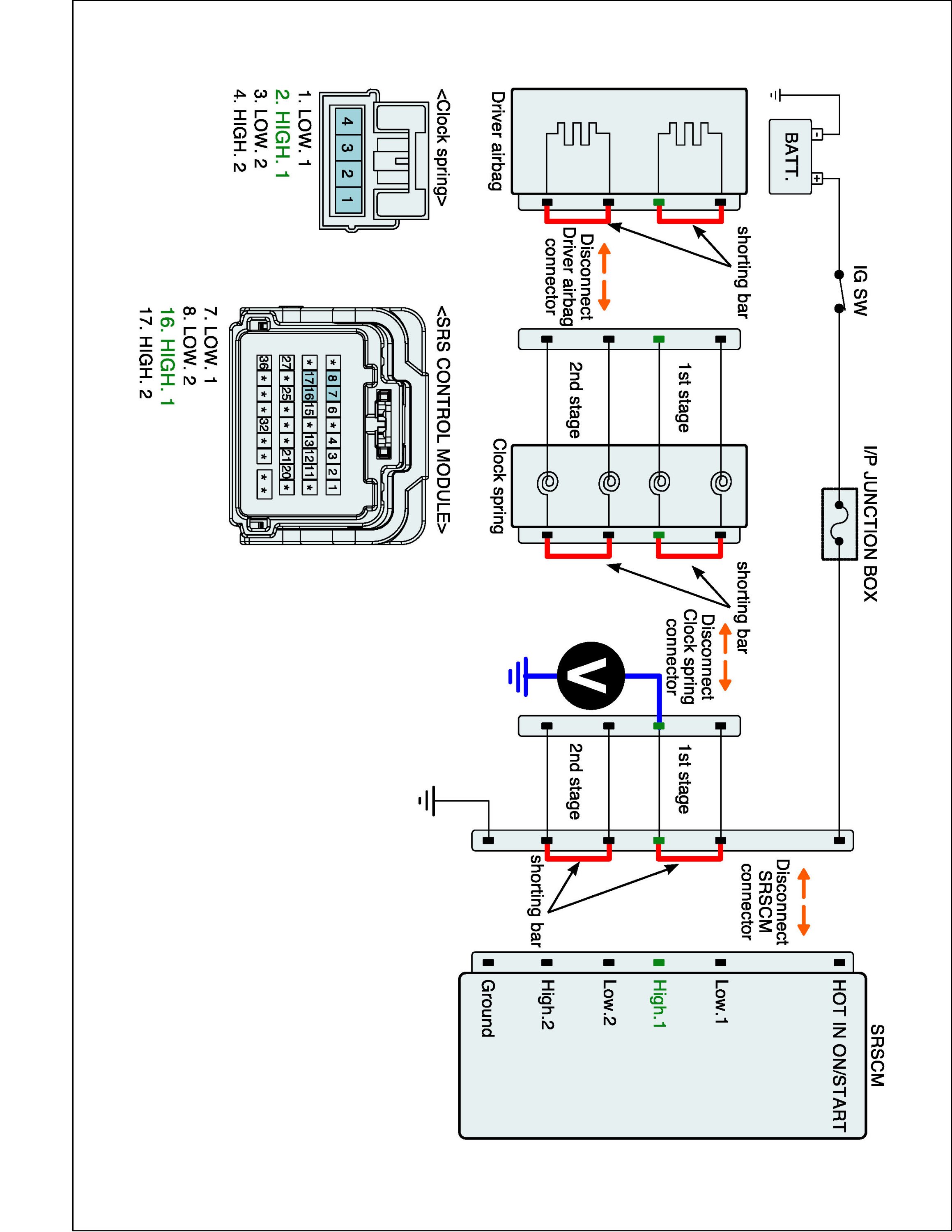 5. Measure Voltage between terminal "Low.1" or "High.1" of the clock spring harness connector and chassis ground.