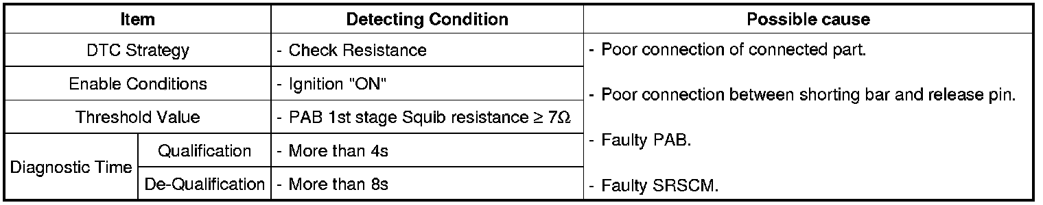 The SRSCM sets DTC B1352 if the measured resistance value of PAB circuit is more than the threshold value.