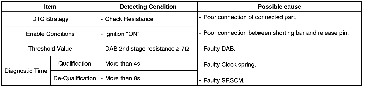 The SRSCM sets DTC B1481 if the measured resistance value of DAB circuit is more than the threshold value.