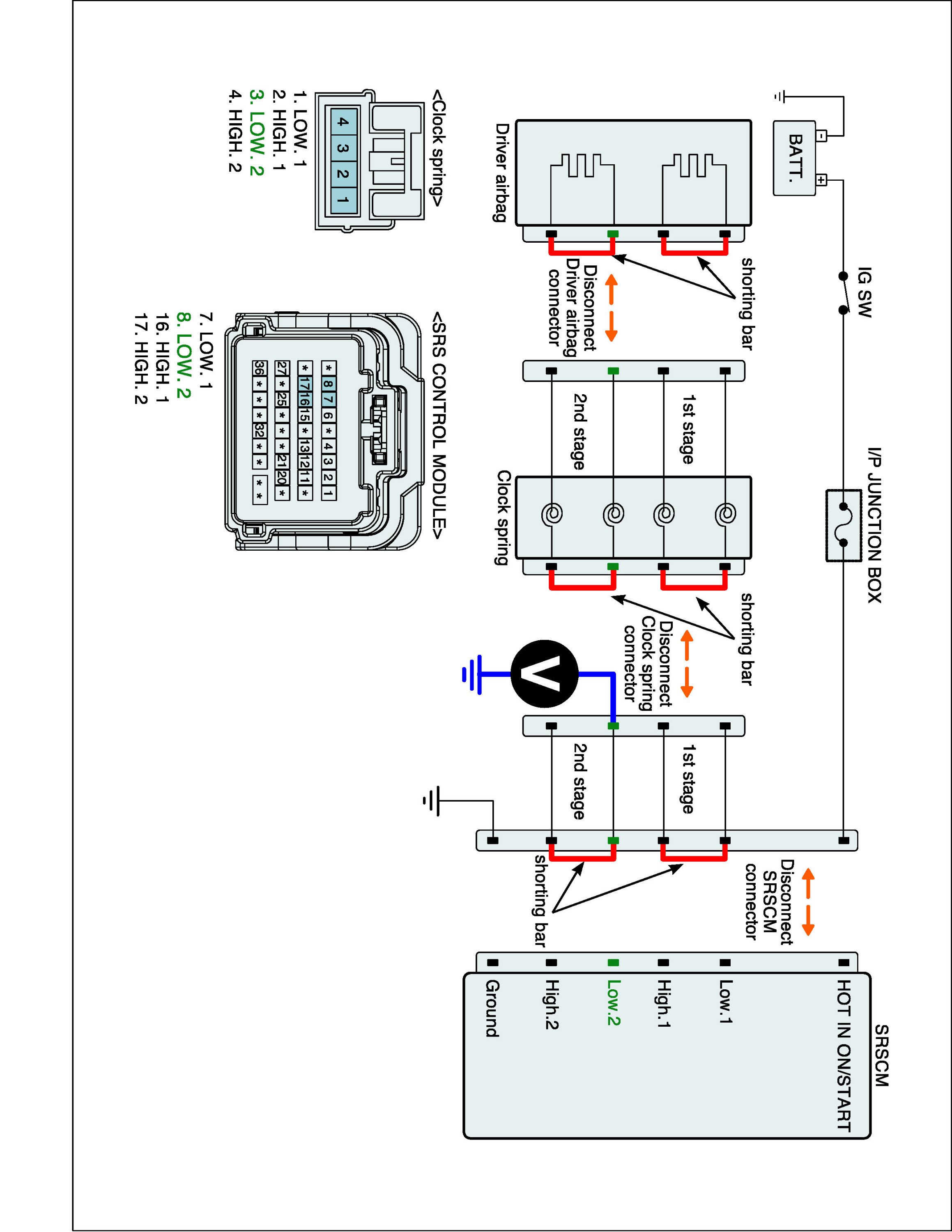 5. Measure Voltage between terminal "Low.2" or "High.2" of the clock spring harness connector and chassis ground.