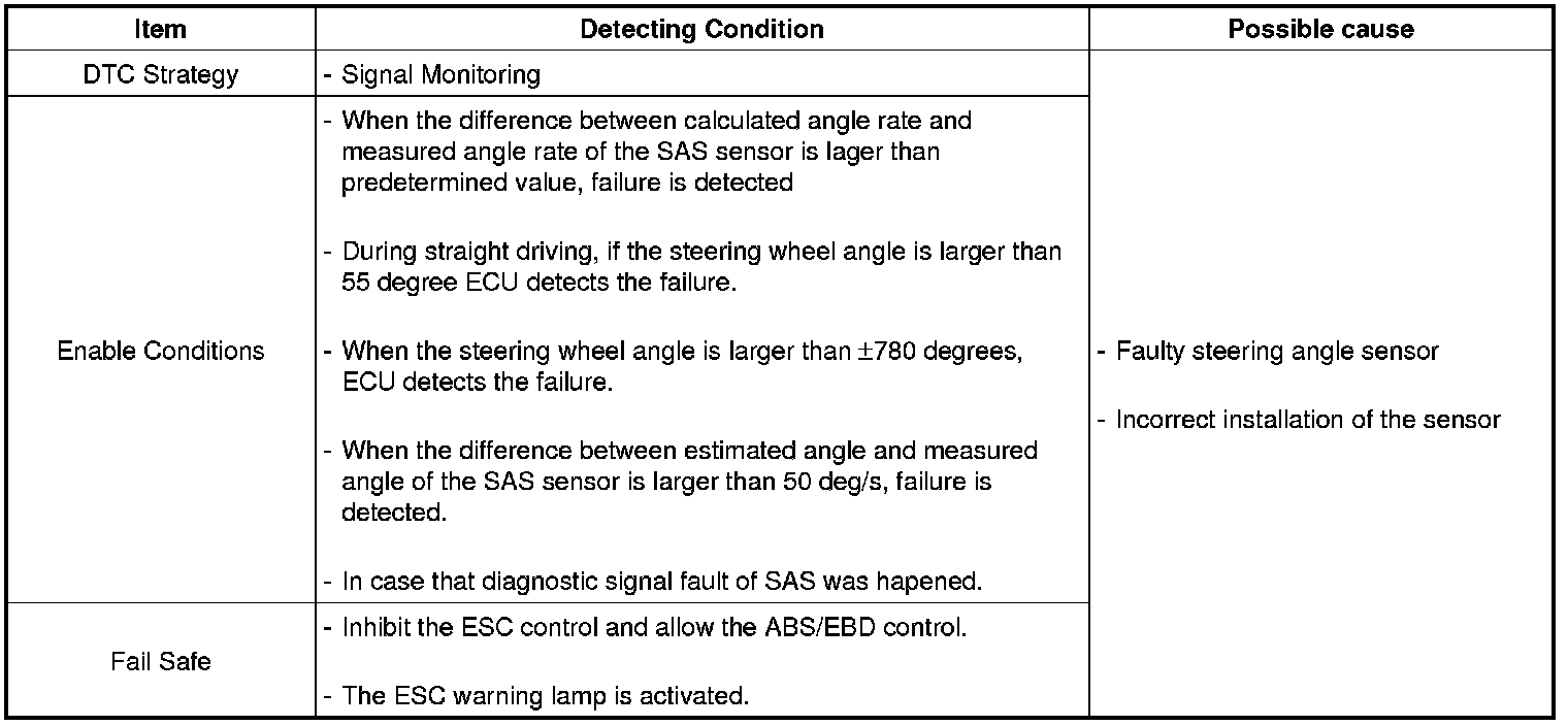 The HECU monitors signals of the steering angle sensor and if the measured angle from the sensor differs with the calculated angle, the ECU detects the failure and sets this code.