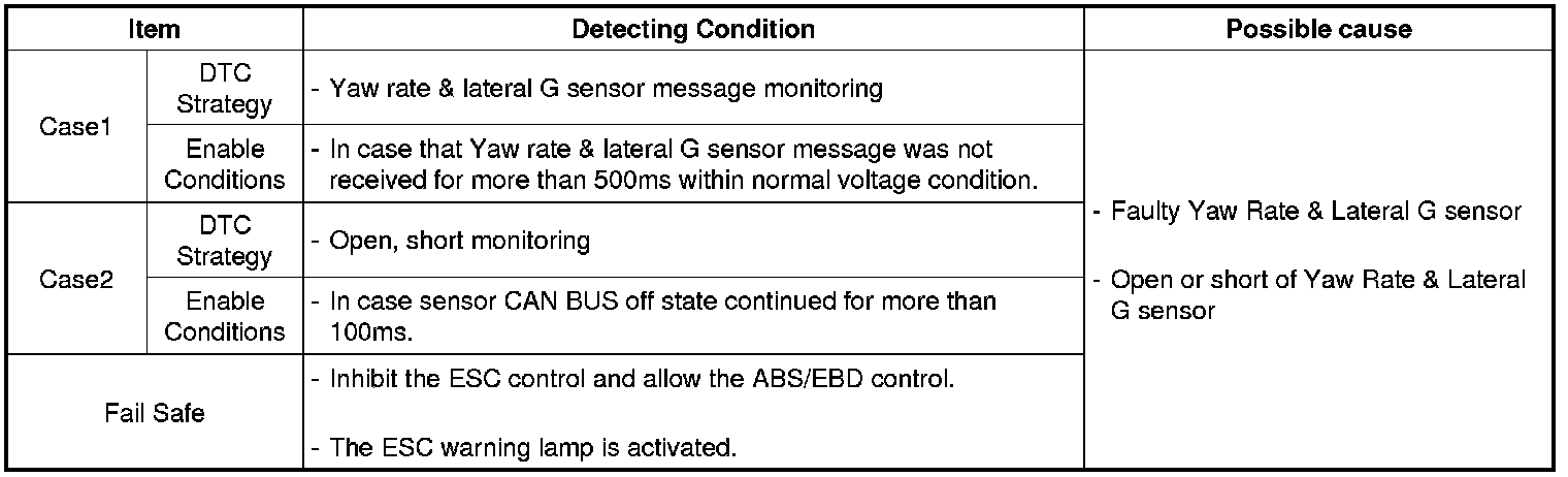 A failure is detected if the Yaw rate & lateral G sensor's message was not received or HECU detects CAN Bus off state for more than the specified failure detection time.