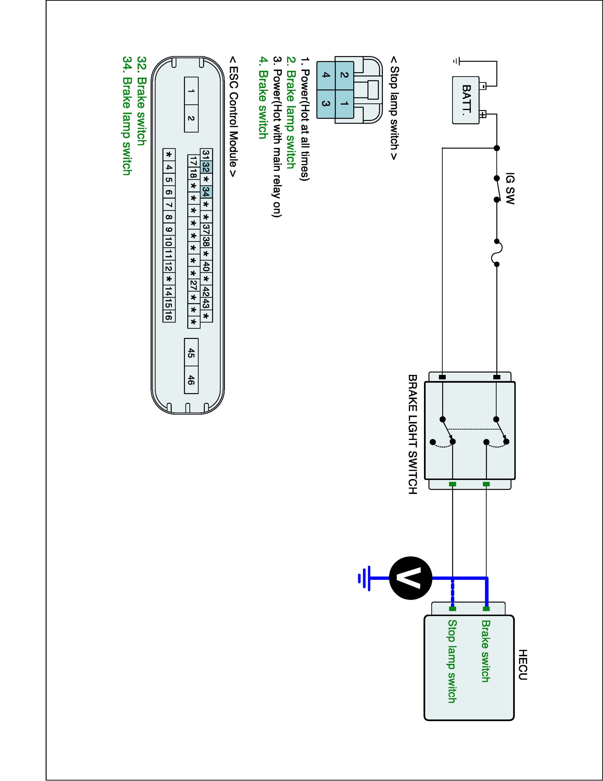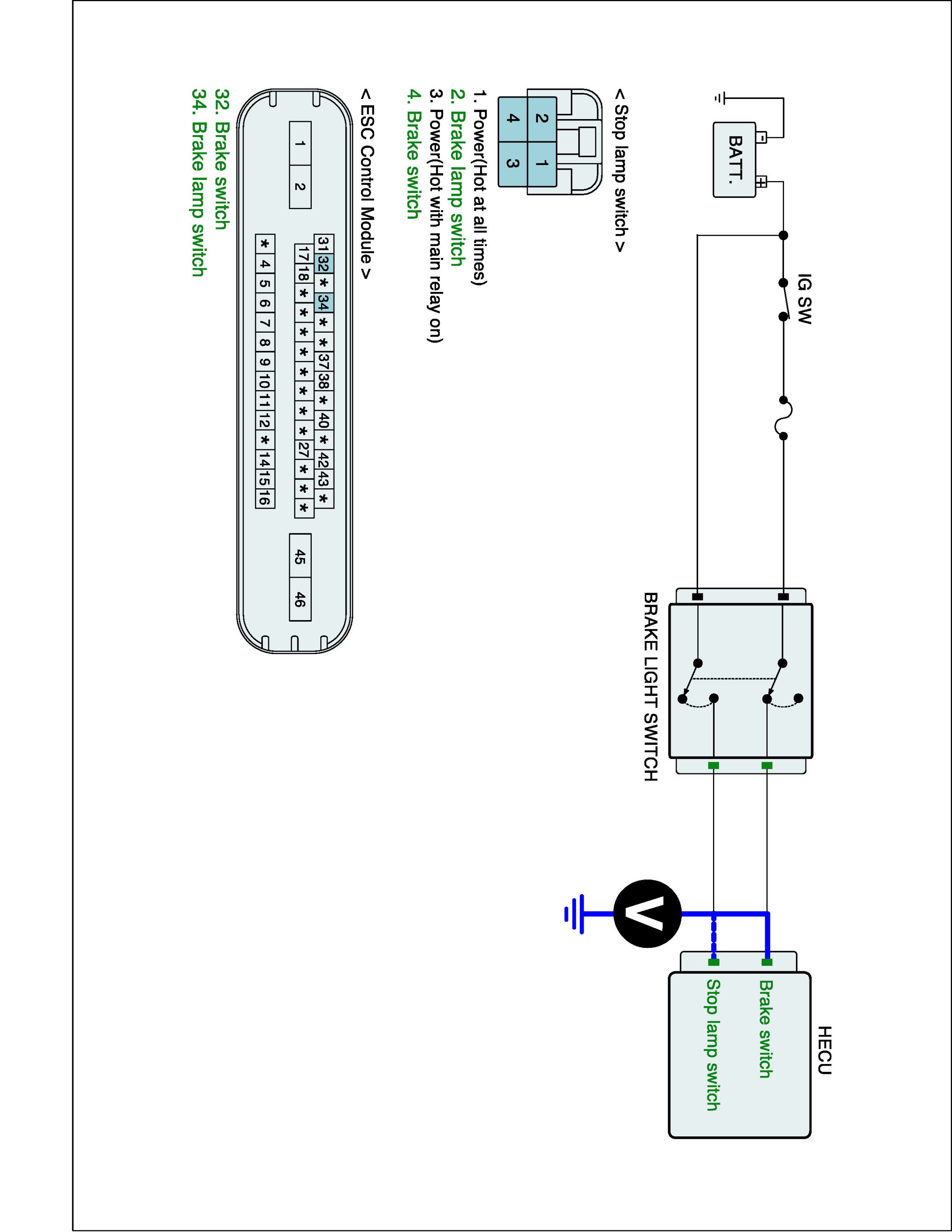 2. Measure voltage between stop lamp switch (brake switch) terminal of the HECU harness connector and chassis ground.