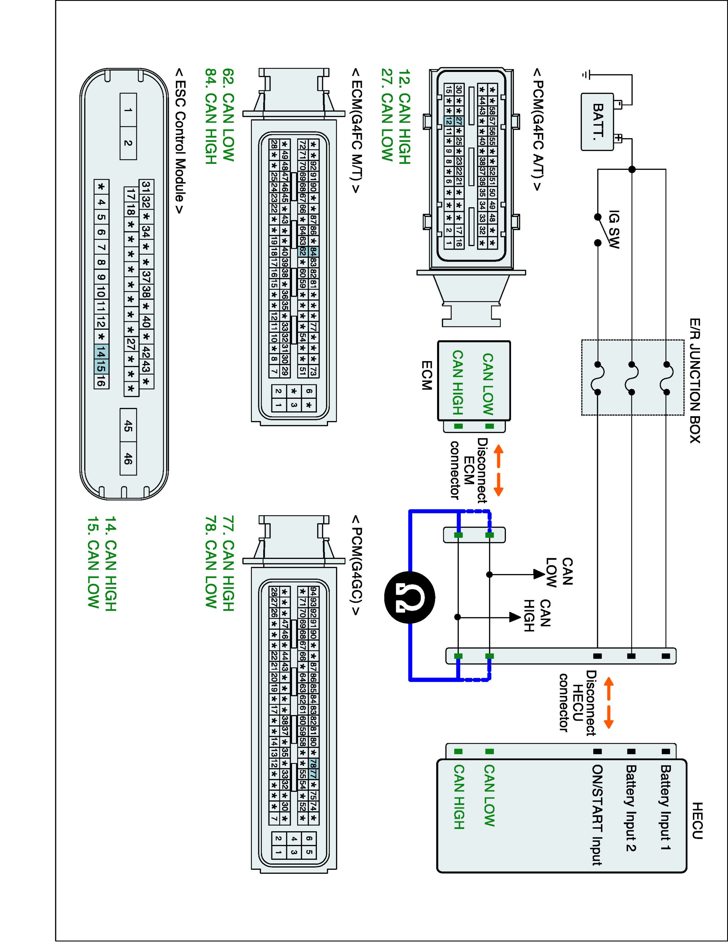 3. Measure resistance between CAN HIGH terminal (LOW terminal) of the HECU harness connector and CAN HIGH terminal (LOW terminal) of the ECM harness connector.