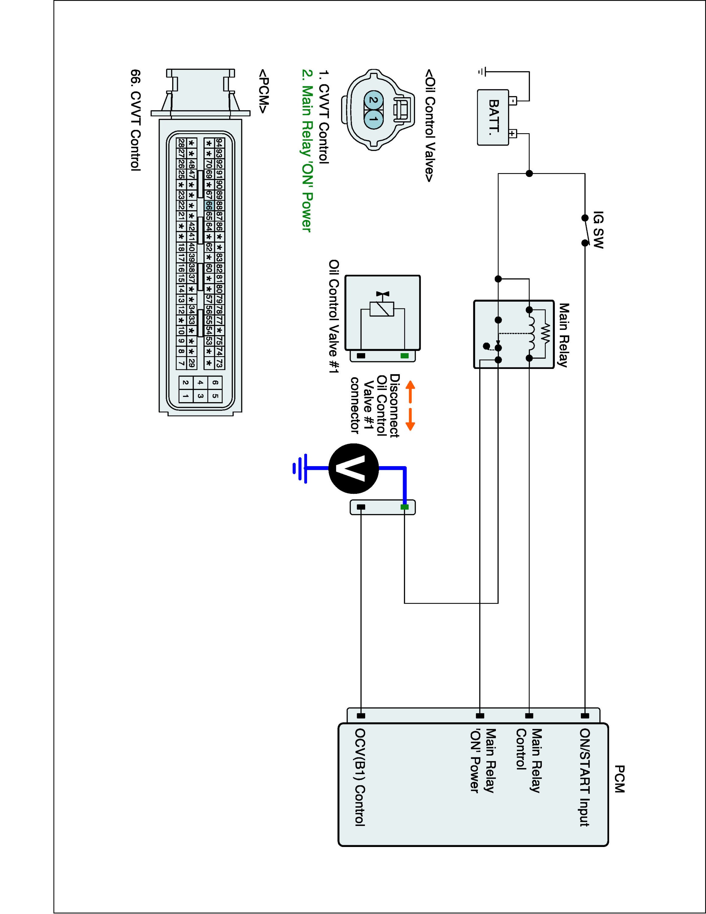 1. Measure voltage between terminal 1 of the oil control valve harness connector and chassis ground.