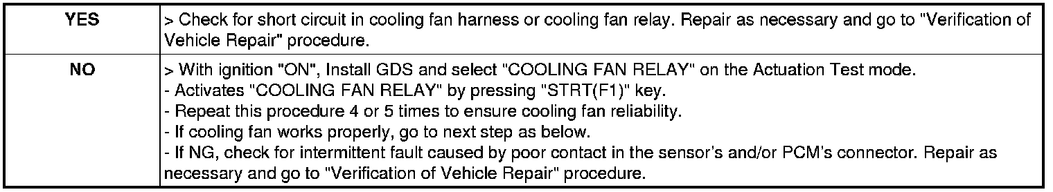 5. Are the cooling fans running when engine coolant temperature is low (less than approximately 98°C (208°F)) with A/C OFF?