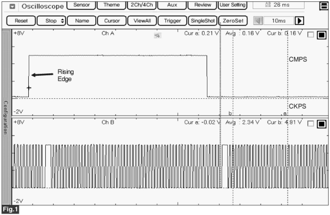 Fig 1.2) The CMPS falling (rising) edge is coincided with 3 - 5 tooth of the CKP from one longer signal (missing tooth)