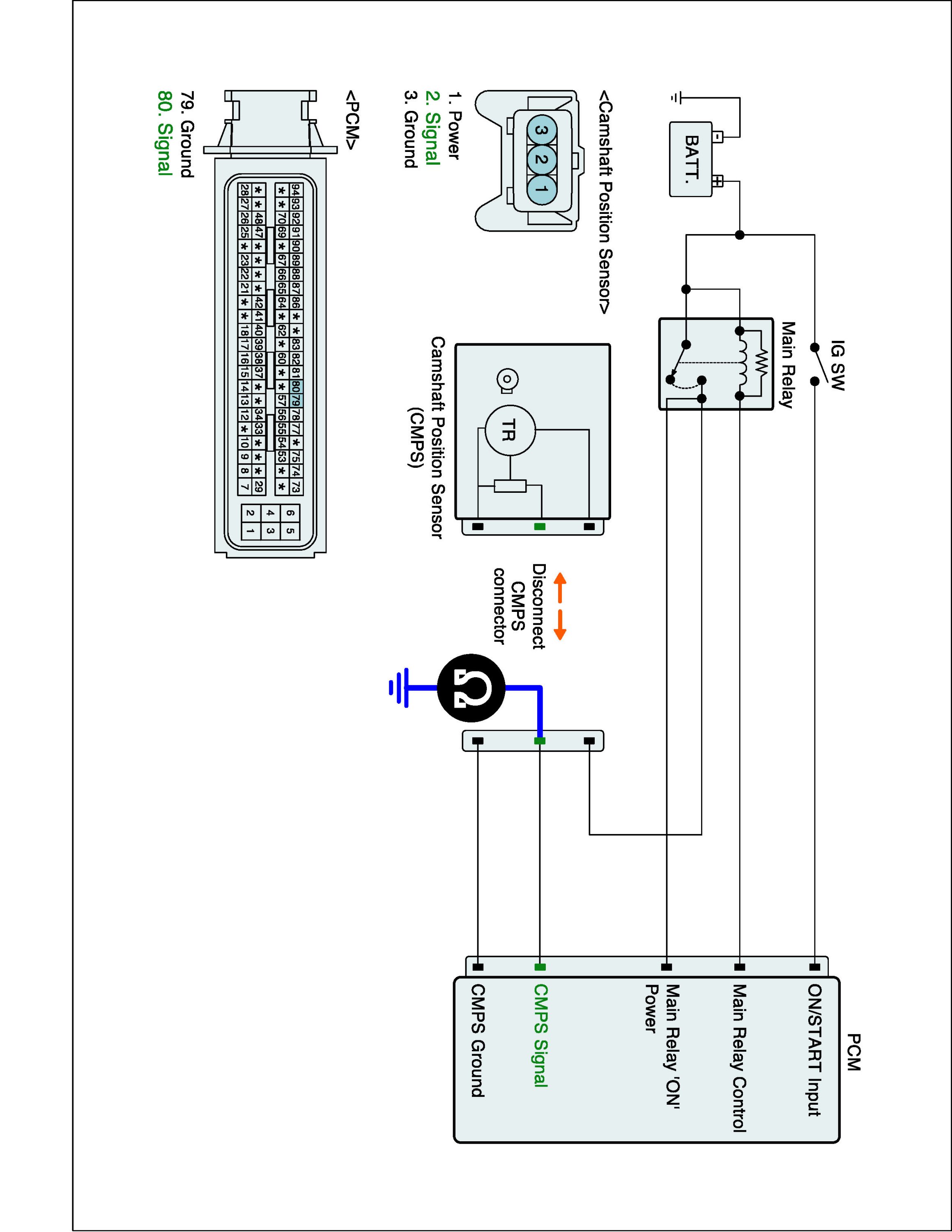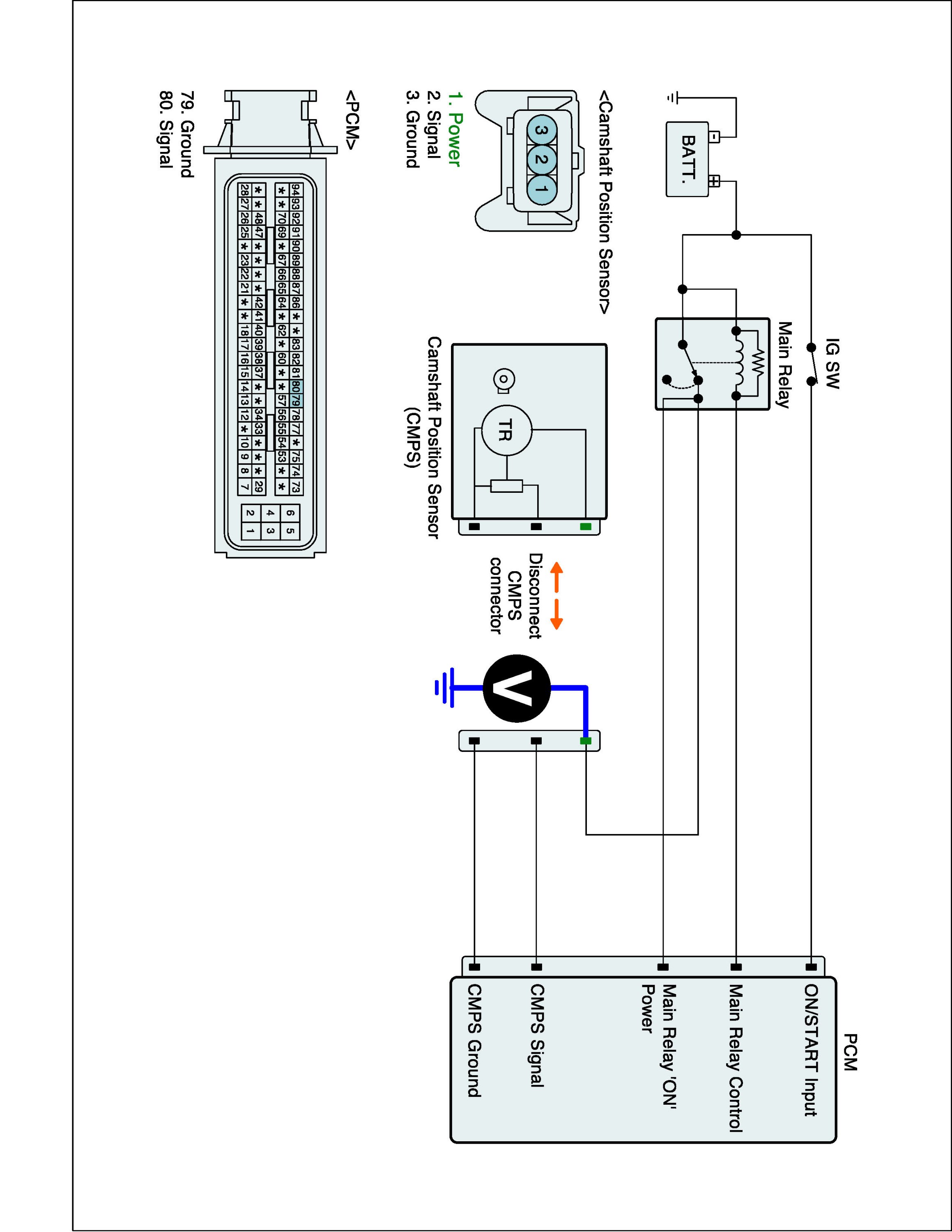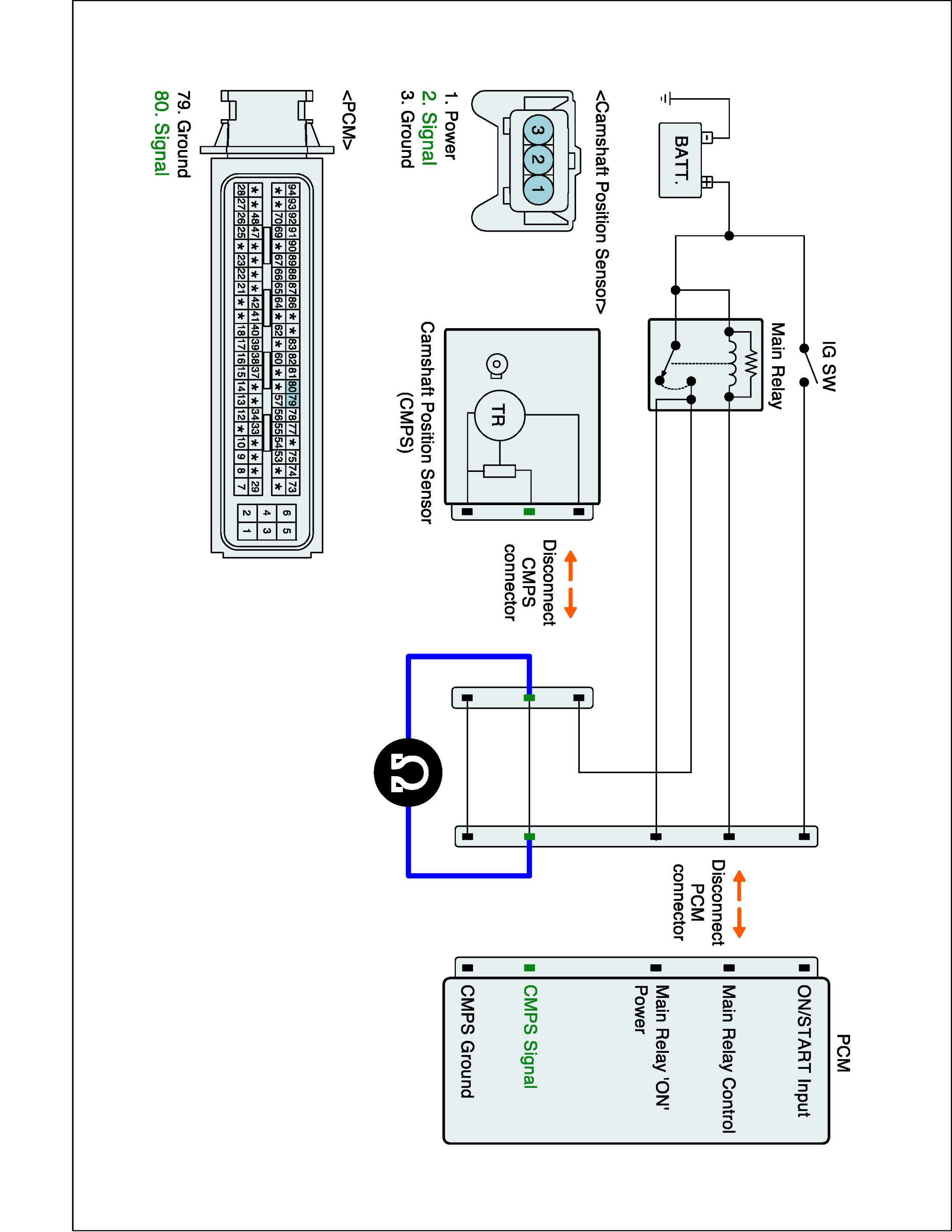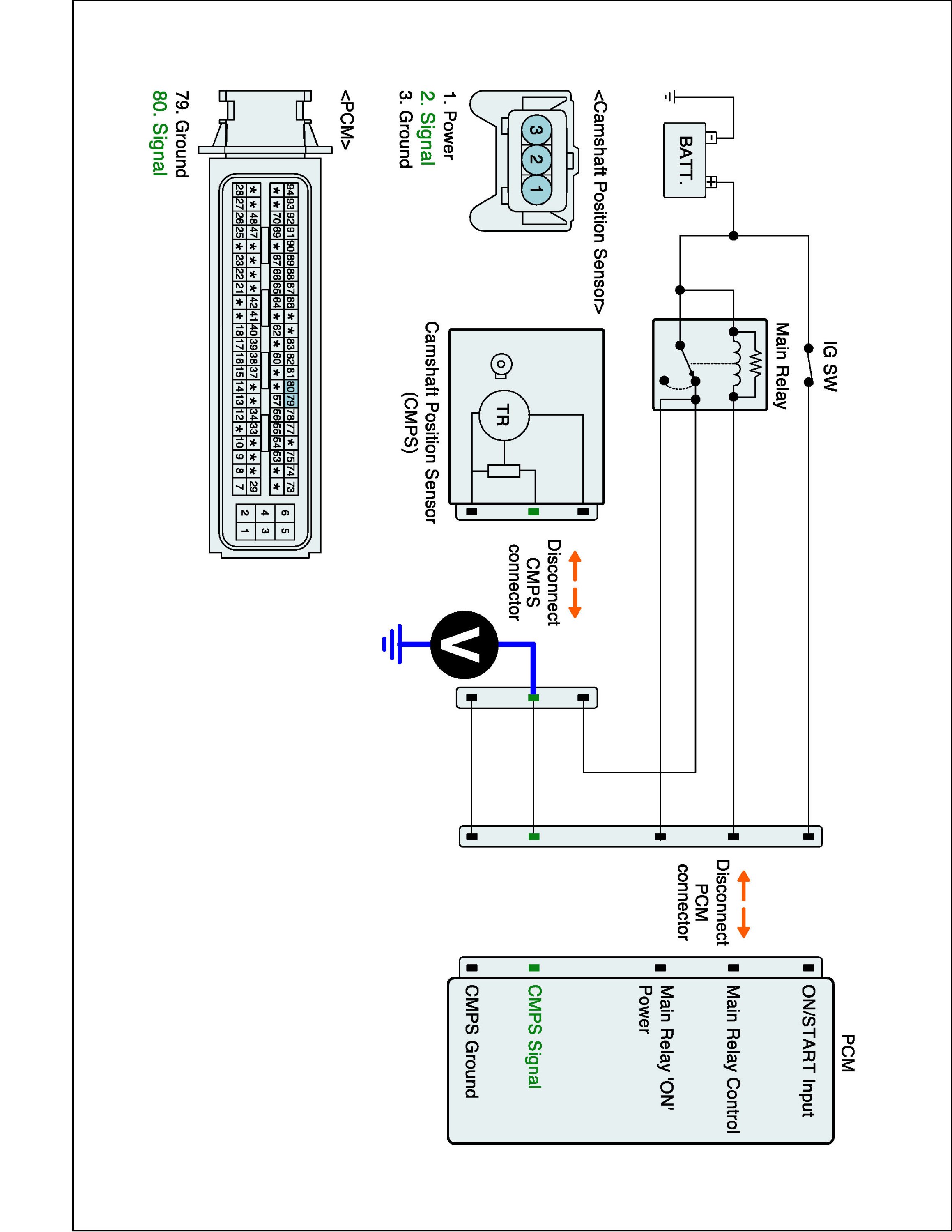 (2) Measure resistance between signal terminal of CMPS harness connector and CMPS signal terminal of the PCM connector.