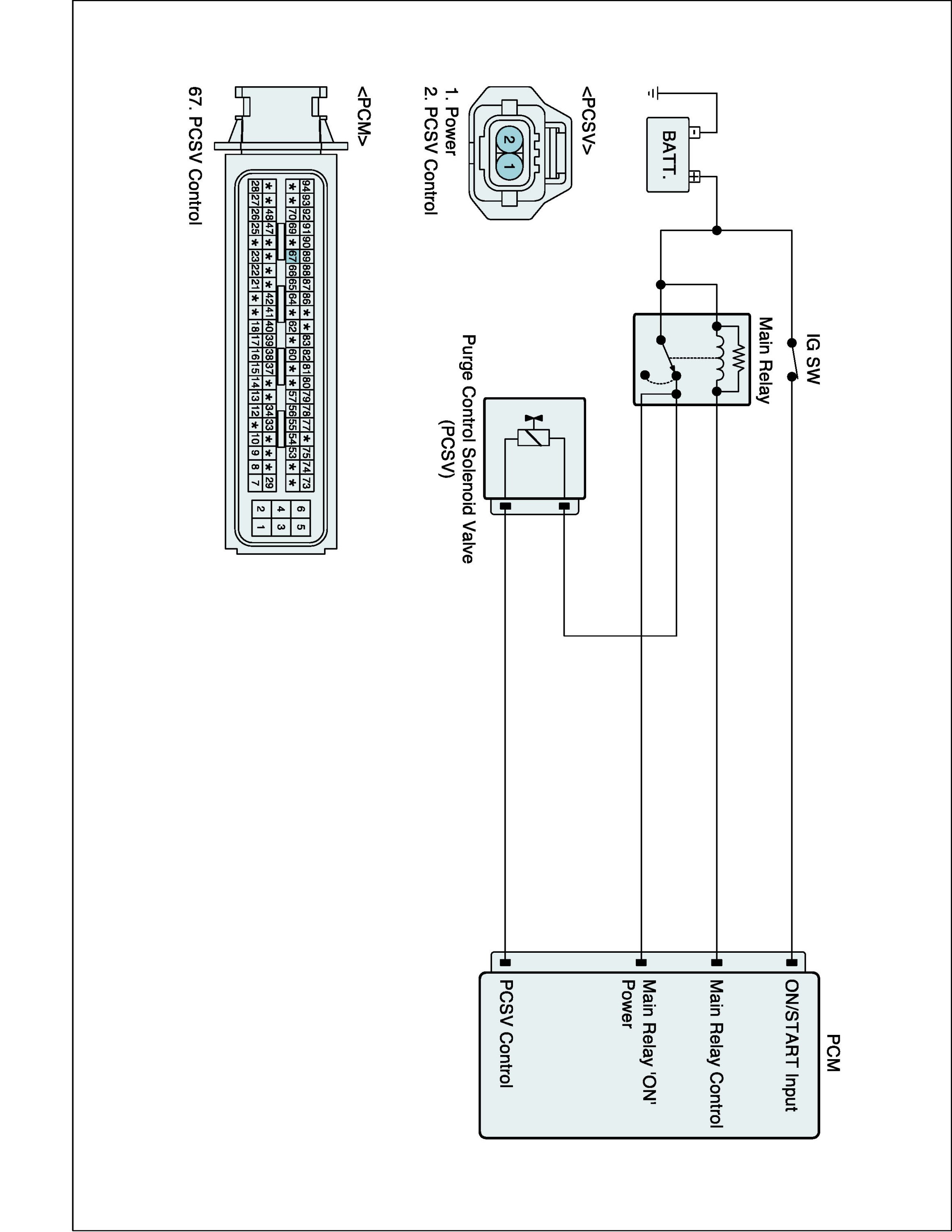 The evaporative emission control system prevents hydrocarbon (HC) vapors from the fuel tank from escaping into the atmosphere where they could form photochemical smog. Gasoline vapors are collected in the charcoal canister. The PCM controls the Purge Control Solenoid Valve (PCSV) to purge any collected vapors from the canister back to the engine for combustion. This valve is actuated by the purge control signal from the PCM and controls fuel vapor flow from the canister to the intake manifold.