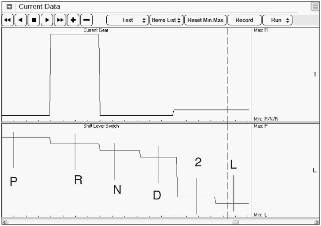 The Transaxle Range Switch sends the shift lever position information to the TCM using a 12 V (battery voltage) signal. When the shift lever is in the D (Drive) position the output signal of Transaxle Range Switch is 12 V and in all other positions the voltage is 0 V. The TCM judges the shift lever position by reading all signals, for the Transaxle Range Switch, simultaneously.