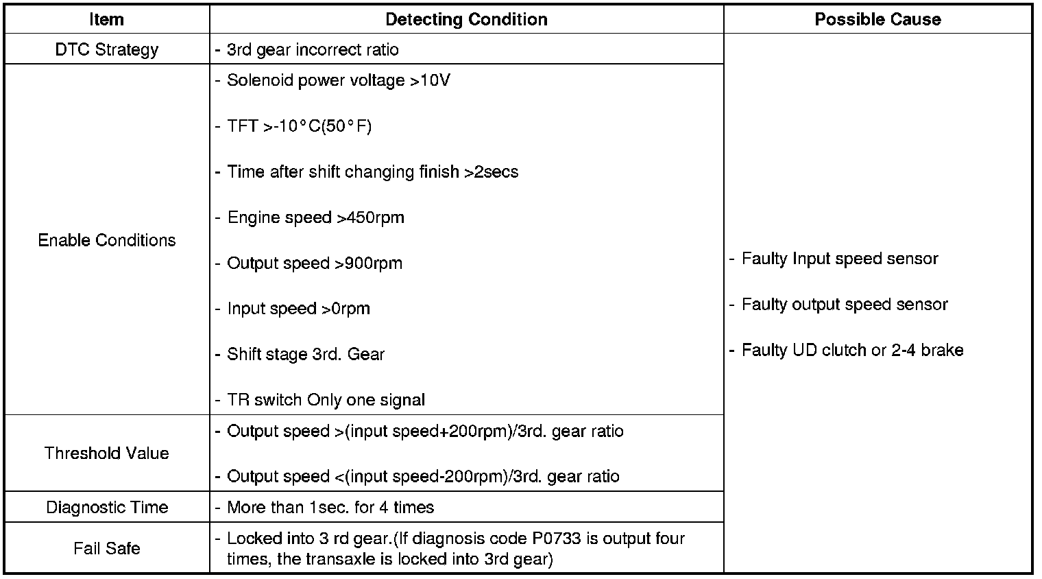 This code is set if the value of input shaft speed is not equal to the value of the output shaft, when multiplied by the 3rd gear ratio, while the transaxle is engaged in 3rd gear. This malfunction is mainly caused by mechanical troubles such as control valve sticking or solenoid valve malfunctioning rather than an electrical issue.