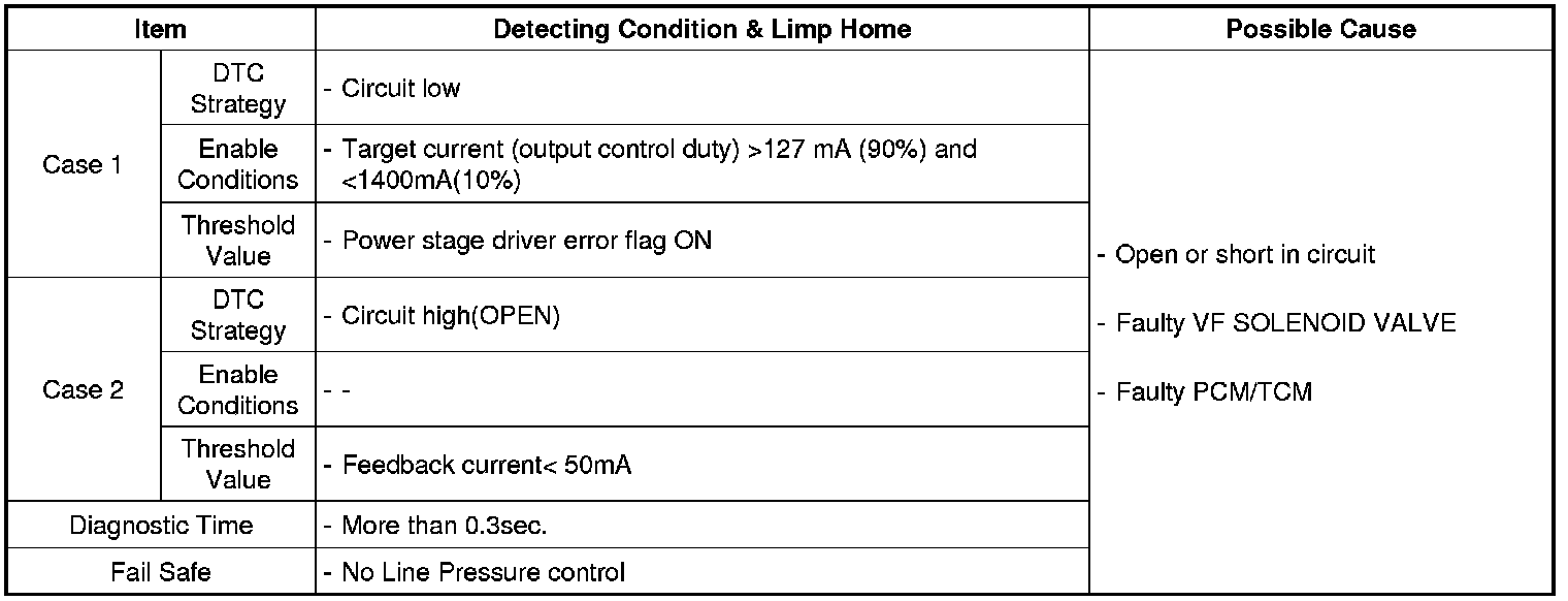 The TCM checks the VFS Control Signal by monitoring the feedback signal from the solenoid valve drive circuit. If an unexpected signal is monitored (for example, high voltage is detected when low voltage is expected, or low voltage is detected when high voltage is expected), the TCM judges that the Low and Reverse control solenoid circuit is malfunctioning and sets this code.