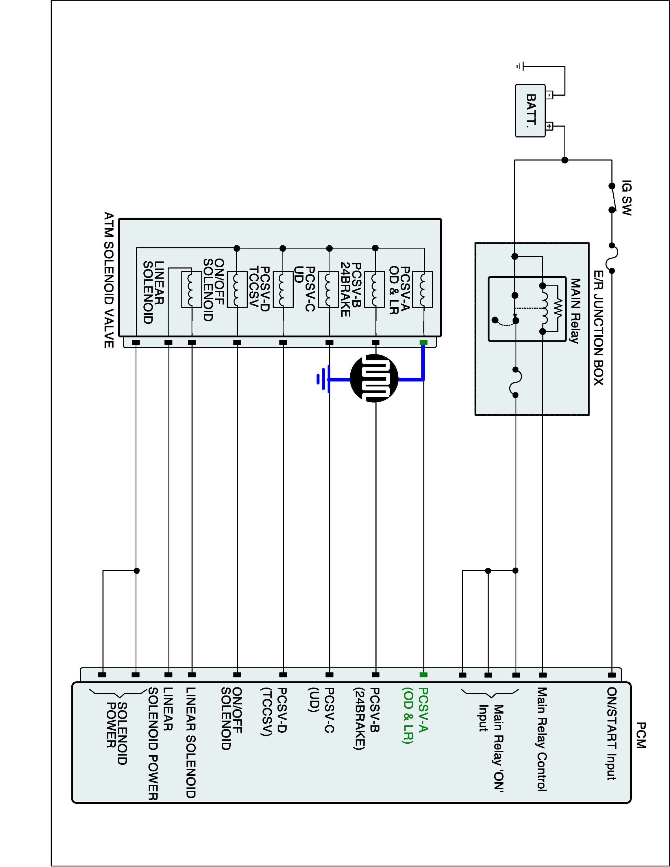 (3) Measure resistance "PCSV-A (OD&LR)" between terminal of the ATM SOLENOID VALVE harness and chassis ground.