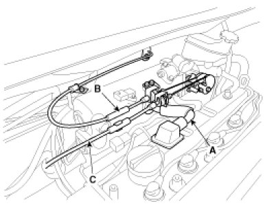 (4) Connect the accelerator cable (B) and the auto-cruise cable (C) from the cylinder head cover.